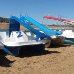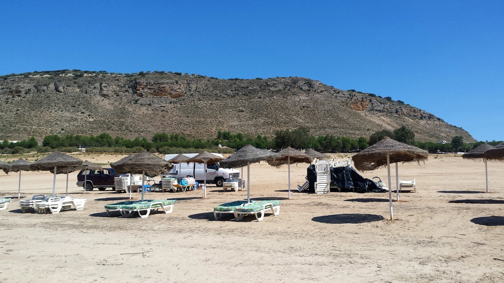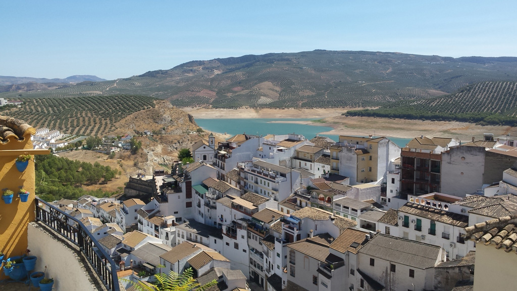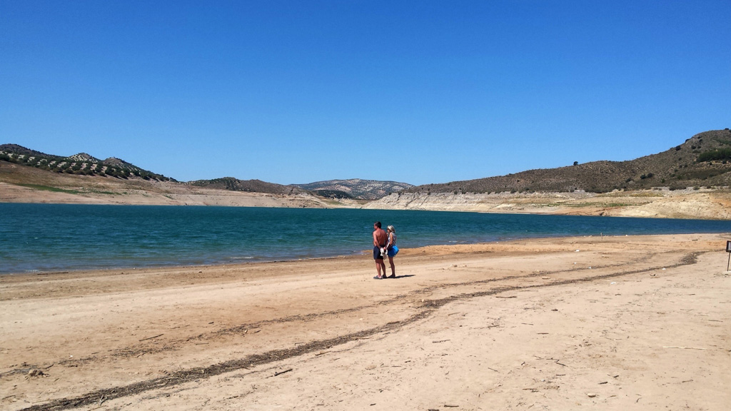 Auf dem Weg von Málaga nach Granada machen wir einen Abstecher nach Iznájar. Der Ort liegt oberhalb eines großen Stausees, dem embalse de Iznájar. Bevor sich die Serpentinen zum See hinunterwinden, eröffnet sich von der Straße aus ein großartiger Ausblick über den türkisfarbenen Stausee und das Dorf, was sich auf der gegenüberliegenden Seite an den Hang klammert. Von oben läd das Wasser zum Baden ein, was sich am Ufer angekommen als weinger appettitlich herausstellt. Durch den extrem niedrigen Wasserstand ist der Strand breit und der Grund am Ufer schlammig. An dem staubigen Strand stehen unbenutzt eine Reihe Tretboote mit Rutschen. Ein paar wenige Besucher sonnen sich – die Autos unweit der Wasserkante geparkt – in einem etwas endzeitlich angehauchten Szenario aus Liegestühlen, Sonnenschrimchen und einer zweifelhaften Kühltruhe nebst Dosenbier.