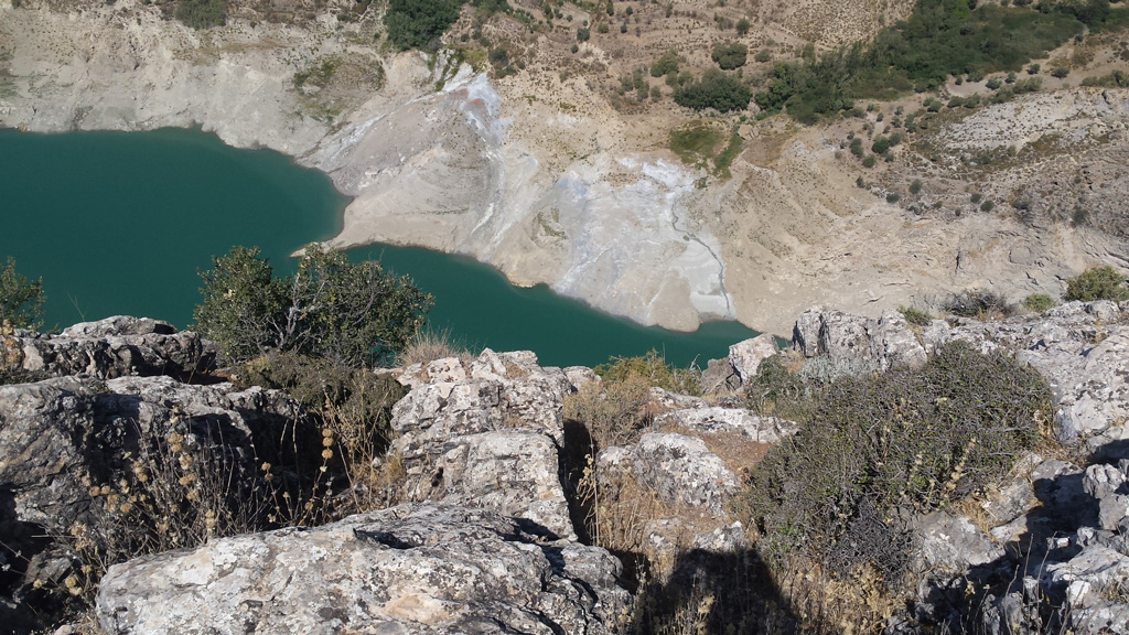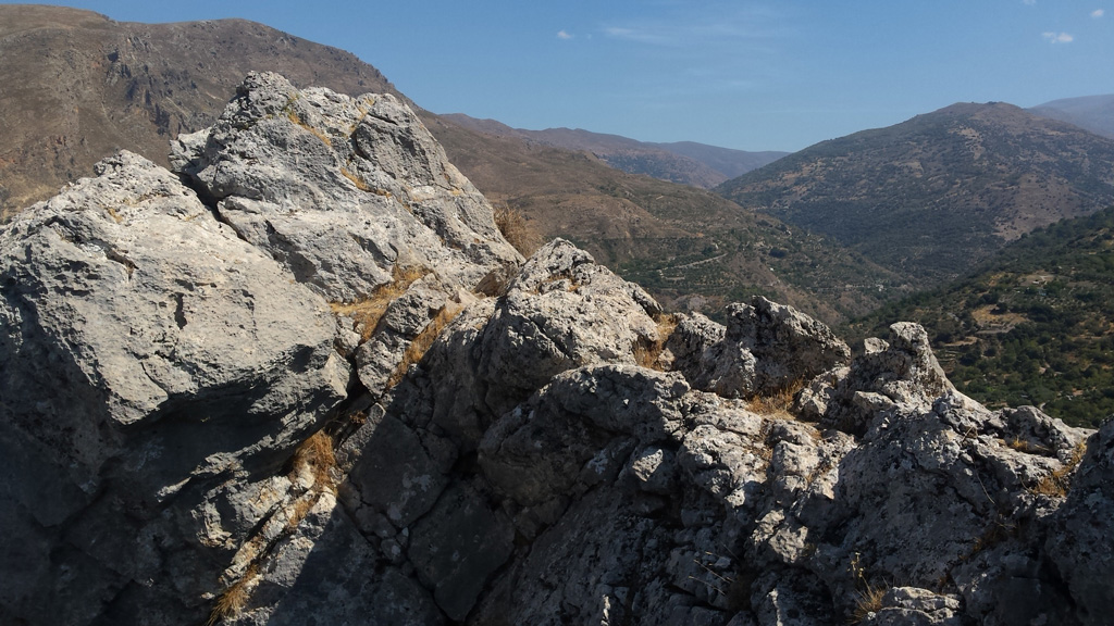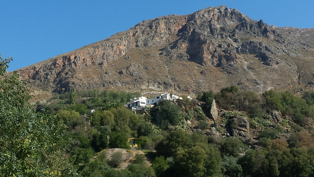 Oberhalb der Talsperre, am Pico de la Lastra, sind die Reste einer ehemaligen Burganlage zu erkennen, dem Castillejo de Güéjar. Dorthin wollen wir. Wieder sind Karte und Beschreibungen nur orientativ und wir verlaufen uns auf einem sehr schmalen Pfad entlang einer acequia – einem kleinen Bewässerungskanal. Die Idee vom “Spaziergang” hat sich überholt. Das Gelände ist steil und wir müssen häufig durch dorniges Gestrüpp kriechen. Auf dem betonierten Rücken eines alten Aquädukts überqueren wir die Schlucht und versuchen über die Felsen hochzuklettern zu einem Weg, den wir von unten sehen konnten. Das geben wir jedoch schnell wieder auf und überlassen das Klettern den Bergziegen, die wir ab und zu in schwindelnden Höhen an den Felsen entlanghopsen sehen. Eine gute Entscheidung, wie sich schnell zeigt. Nur ein paar hundert Meter weiter auf dem alten Pfad erreichen wir den gekennzeichneten Wanderweg, der an einer flachen Stelle über den Wasserlauf in der Schlucht führt und uns sicher zum Castillejo bringt.