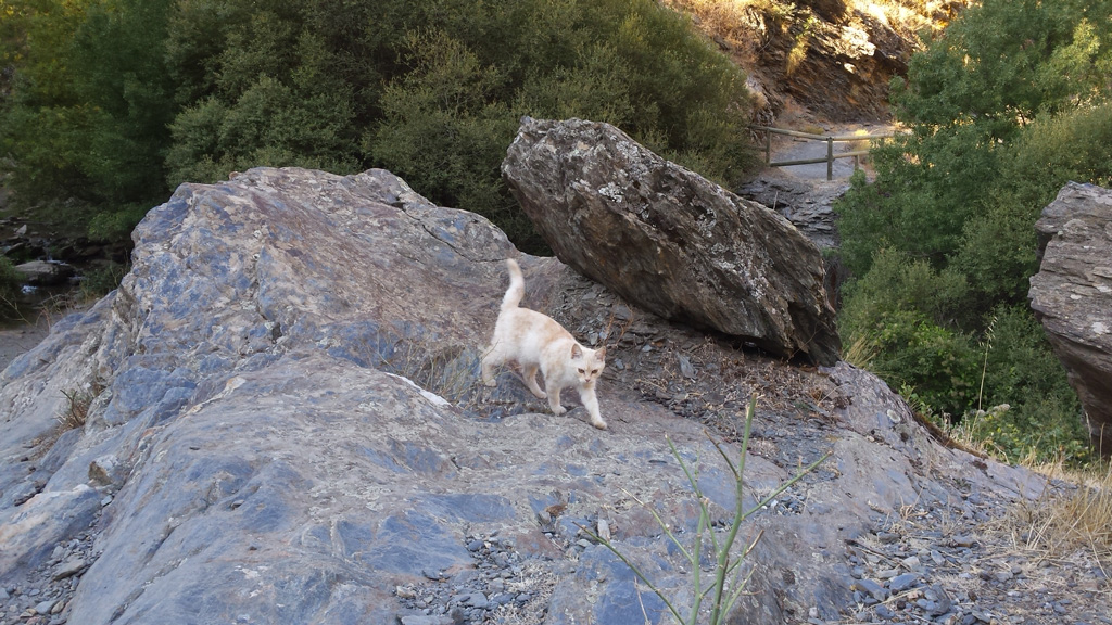 Auf dem Rückweg, etwa 4 km bevor wir den Parkplatz wieder erreichen, laufen uns 4 kleine Katzen zu, die uns bis zum Barranco de San Juan folgen. Am liebsten würde ich sie natürlich Laura aufschwatzen, aber das Unterfangen bleibt erfolglos.