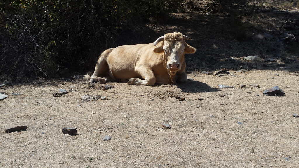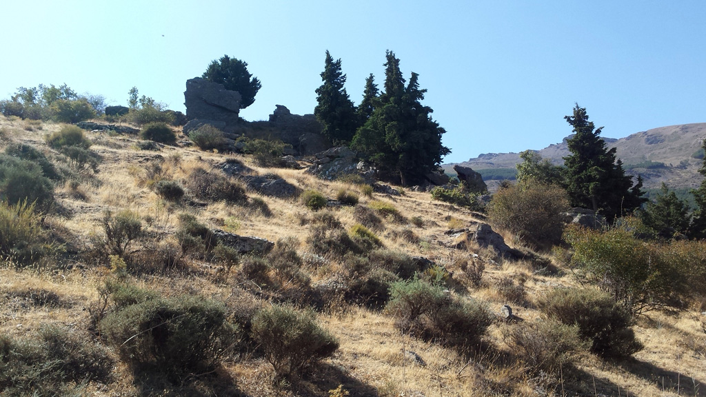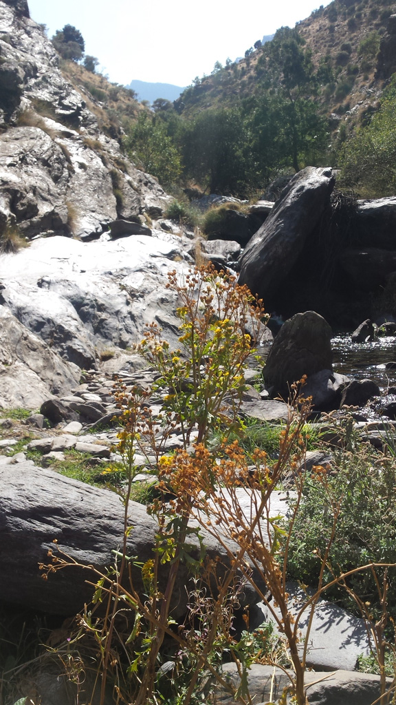 Nach ca. 1 Stunde Aufstieg erreichen wir sanfteres Gelände beim Cortijo del Hoyo. Der kleine Hof war früher bewohnt und die Überreste der ehemaligen Häuser sind noch gut zu erkennen. Der Weg führt nun über Hochplatos Weiden und Waldstücke hoch oben parallel zum Fluss bis zum Cortijo de los Hornillos. Hier machen wir eine längere Pause. Im Süden ist der Mulhacen zu sehen, der höchste Gipfel der Sierra Nevada. Daneben der Alcazaba. Der Abstieg erfolgt über einen Viehpfad und ist recht lang und steil. Unten erreichen wir wieder die Vereda de la Estrella bei dem Cortijo de la Estrella. Die Vegetation ist nahe dem Fluss überwältigend satt und grün. Die großen Kastanienbäume tragen reichlich dicke, hellgrüne Früchte. Der Weg führt noch viel tiefer in das Flusstal hinein, aber für heute schaffen wir nur noch einen kurzen Abstecher zu der Brücke über den Guarnón, einem Zufluss des Genil und den Rückweg.