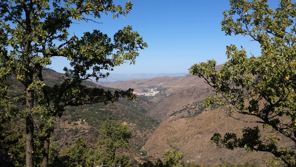 Die Umgebung von Güéjar Sierra mit der Sierra Nevada im Hintergrund läd zum Wandern ein. Laura hat uns mit Tipps versorgt, im B&B gibt es einiges an Karten und Informationsmaterial. Für den ersten Tag suchen wir uns eine leichte Tour mit wenig Höhenunterschied aus. Über das barrio alto verlassen wir Güéjar Sierra auf einer kleinen Straße in Richtung Nordosten. Den Berg Alto de Jarales umrunden wir auf der Nordseite. Am Weg finden wir jede Menge Brombeeren, klein und teils schon rosinenähnlich, aber sehr süß und aromatisch. Auch die meisten Feigen werden offensichtlich nicht geerntet und hängen halbtrocken an den Bäumen. Viele Bäume am Weg sind fast oder ganz vertrocknet – das Fehlen des Niederschlags ist deutlich spürbar. Auf dem Bergkamm des Alto del Barranco del Agua erreichen wir am höchsten Punkt eine Beobachtungsstation für Waldbrand. Von hier aus fällt ein schmaler Weg steil ab in Richtung Westen, an dessen Ende wir Pinos Genil erreichen. Von hier aus fahren wir mit dem Bus zurück nach Güéjar Sierra.