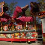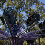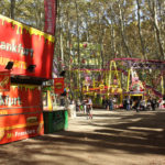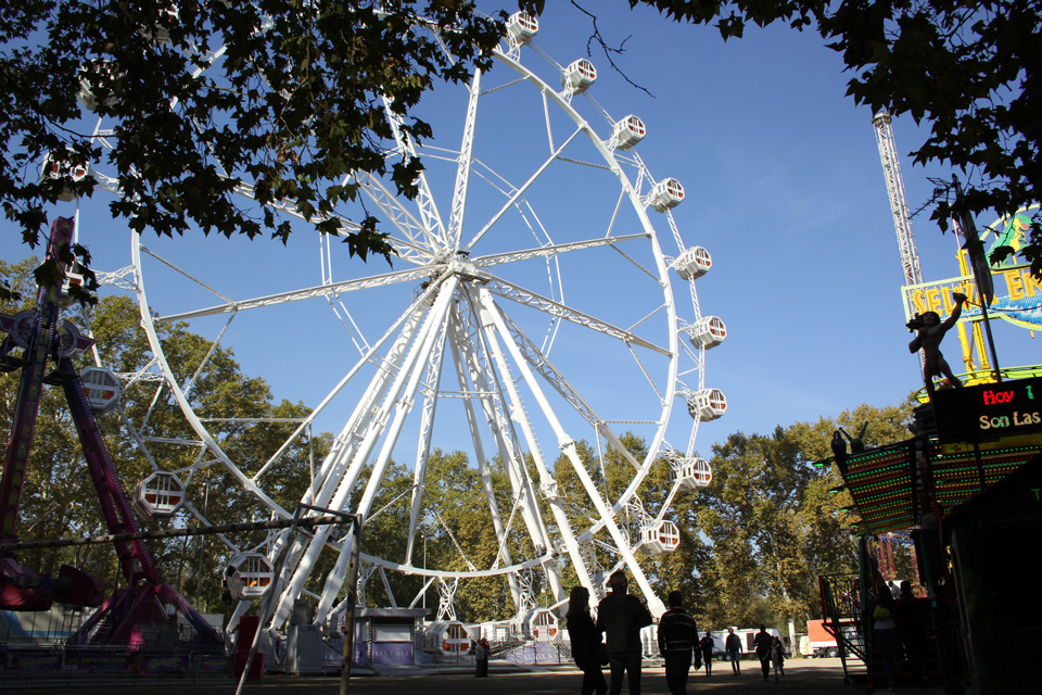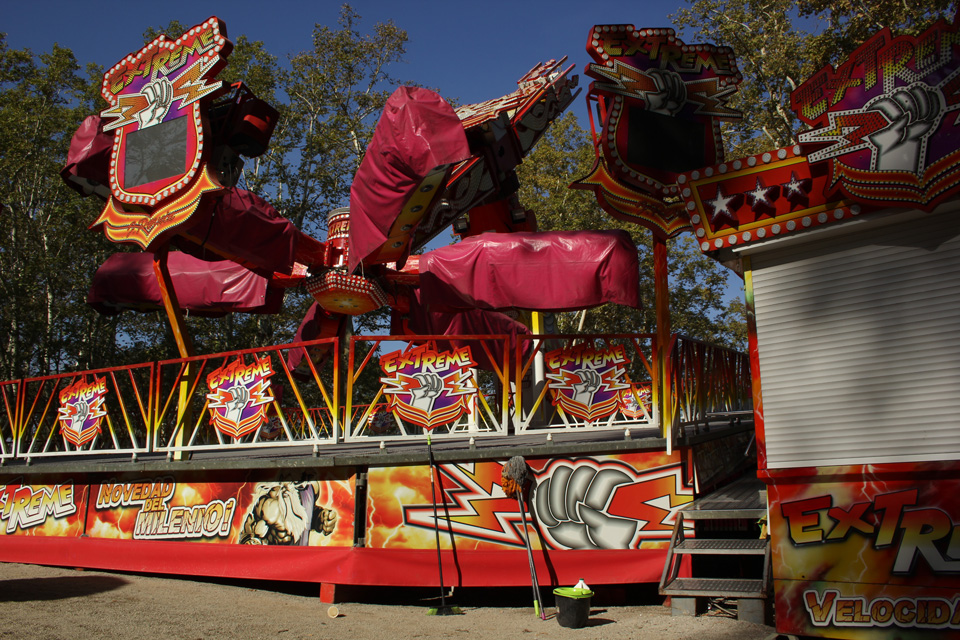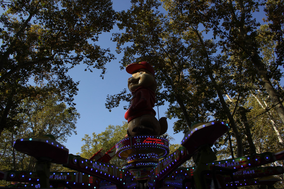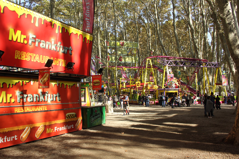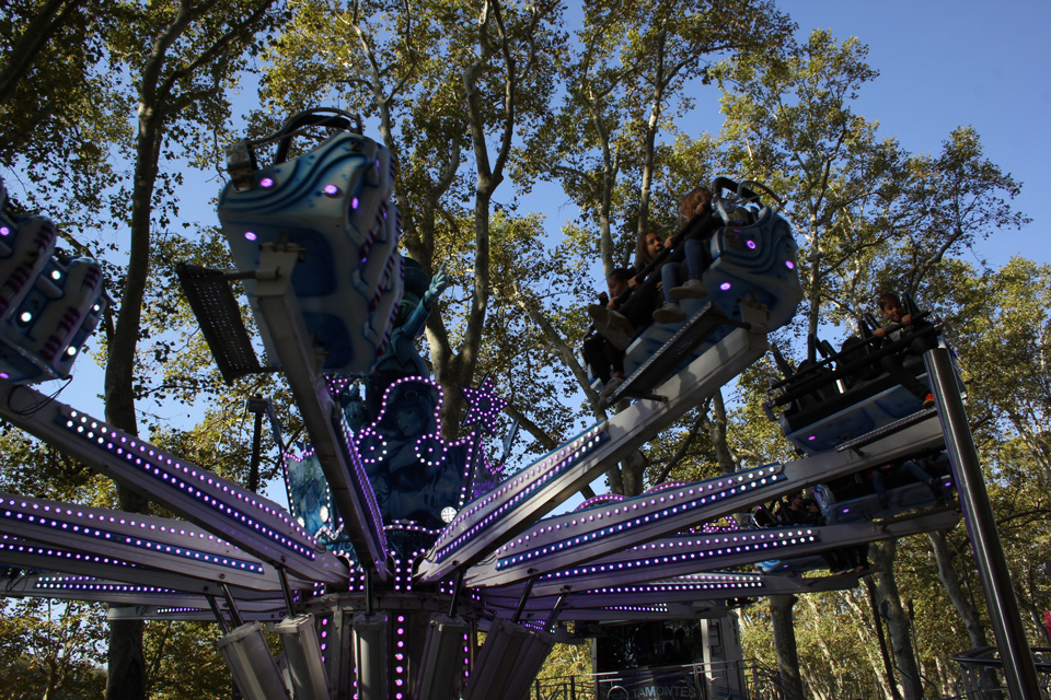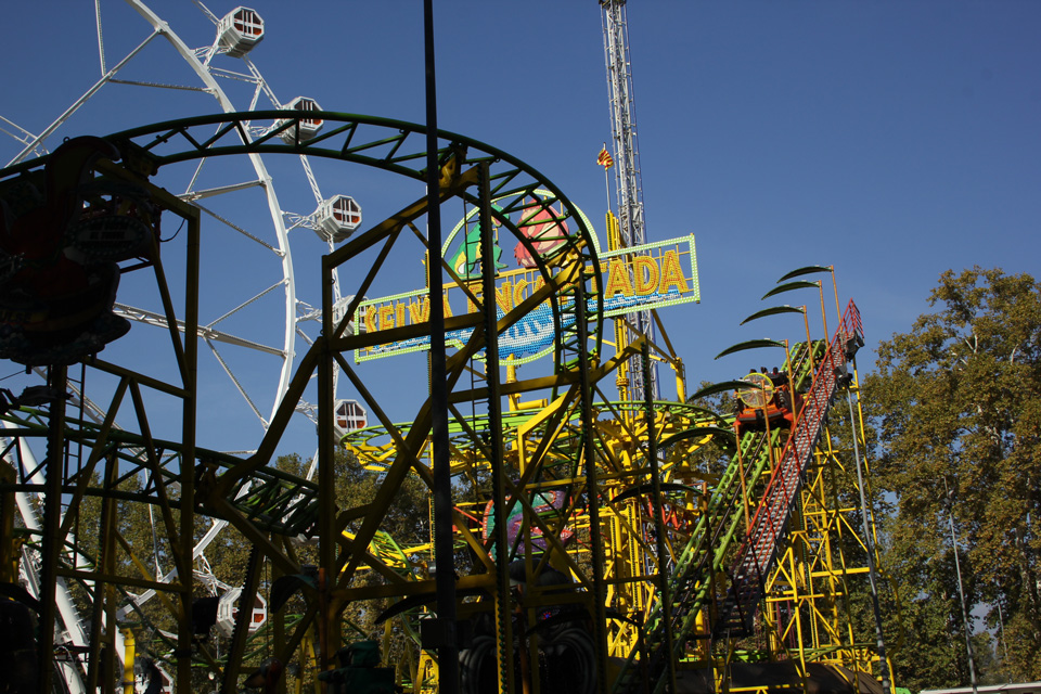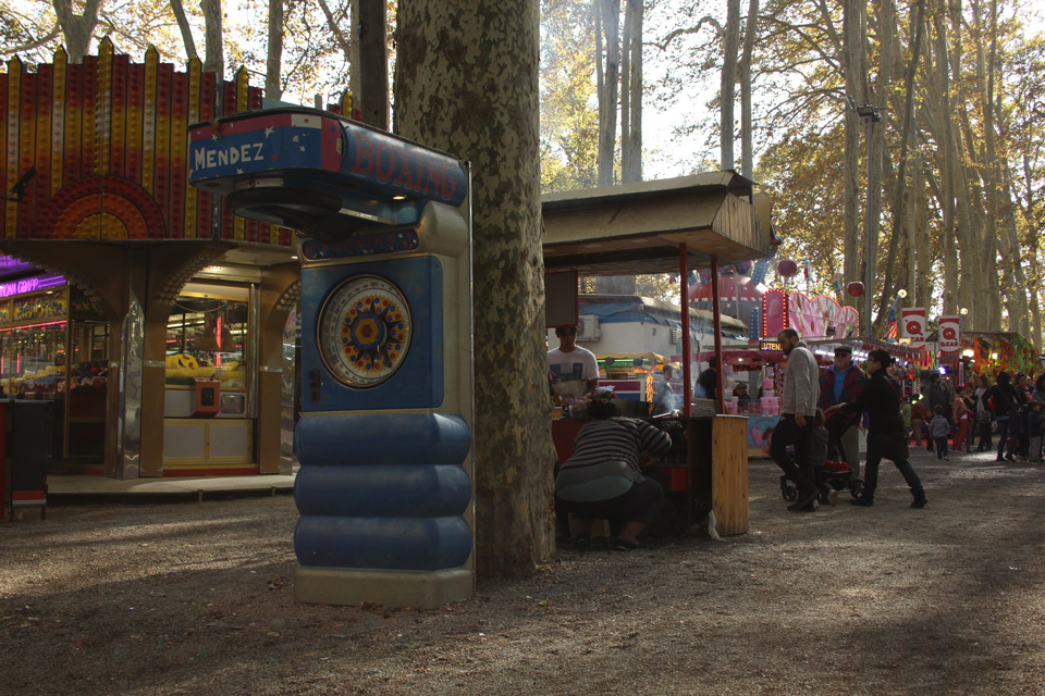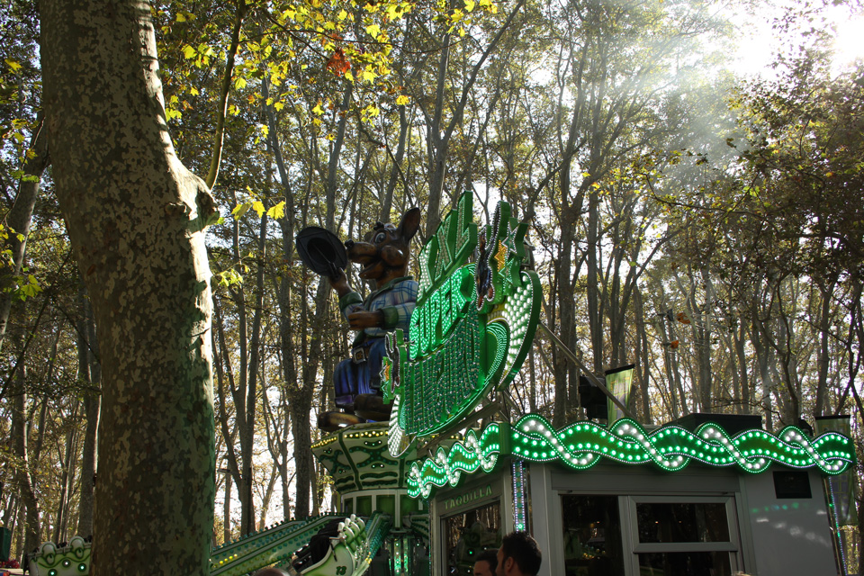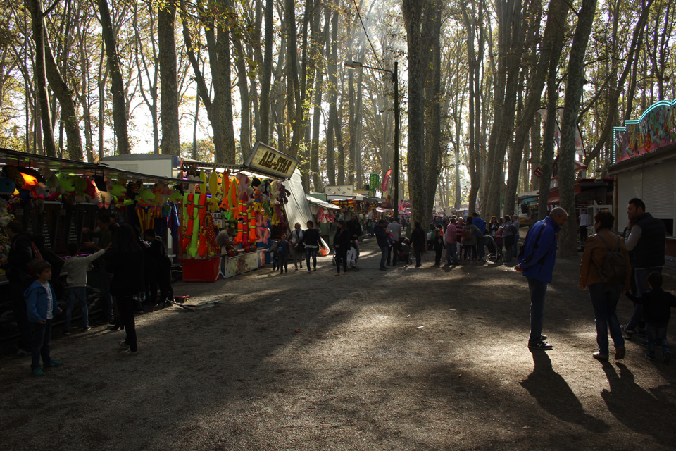 In Girona sind “Fires”, das große Stadtfest. Nachts dringen die Geräusche durch das Tal bis hierher. Die Stimmung ist besonders morgens sehr schön, wenn die Stände öffnen und die Attraktionen langsam in Bewegung kommen. Es gibt viele Stände mit Kastanien und Süßkartoffeln. Vormittags kommen vorwiegend Familien mit Kindern. Zwischen den riesigen Platanen der Devesa sehen die fantastischen Gebilde besonders schön aus.