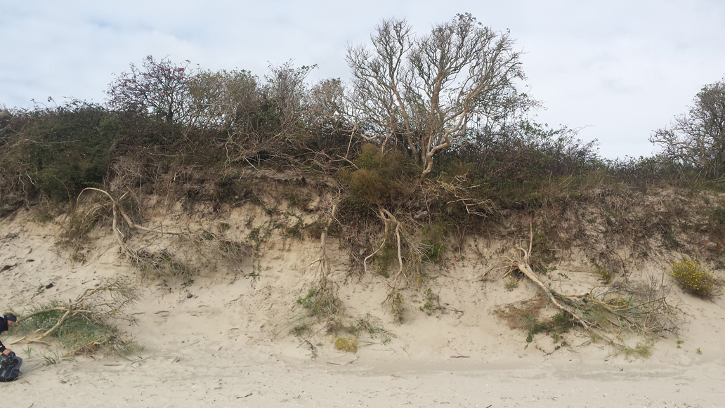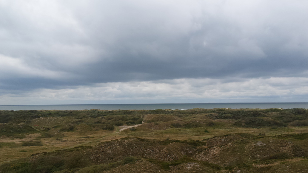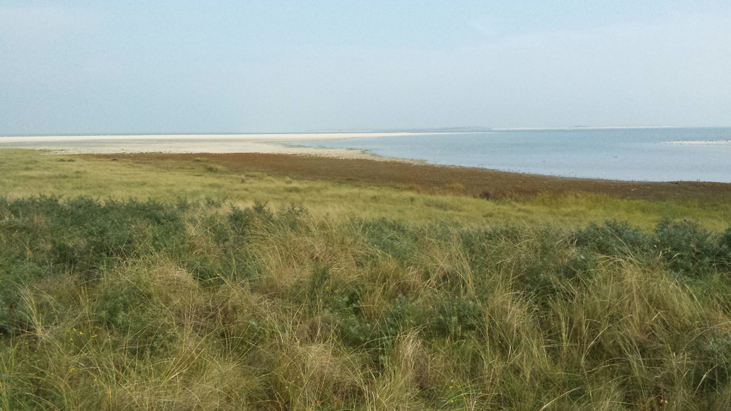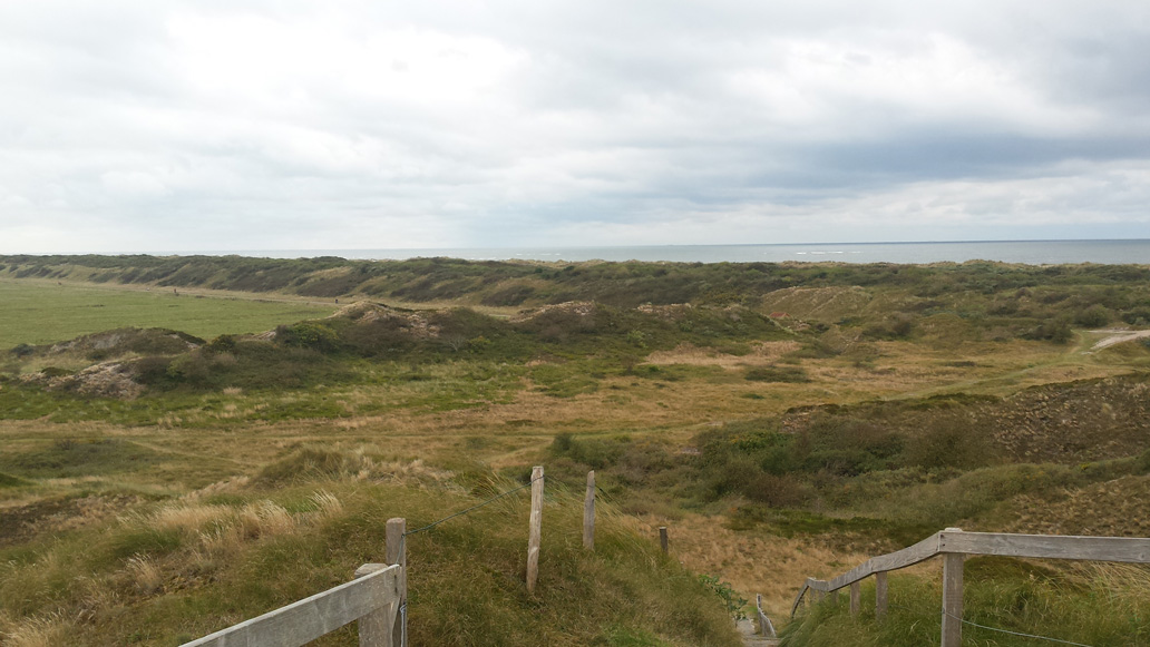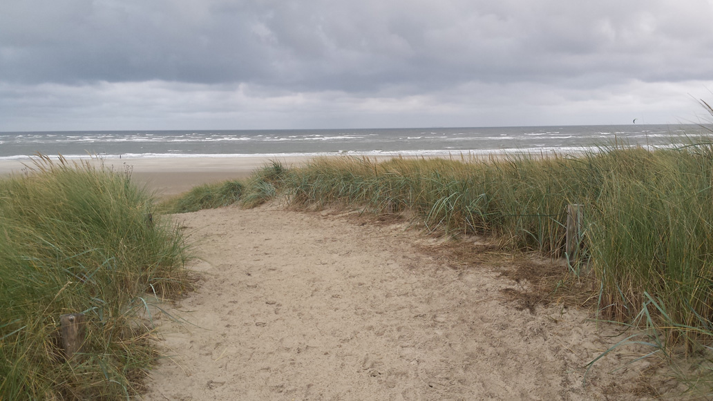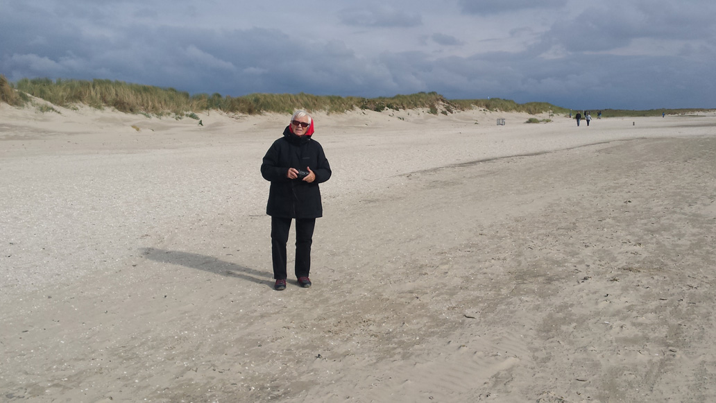Am ersten Tag haben wir sonniges Wetter. Wir fahren mit den Fahrrädern zum Ostende der Insel. Aus Osten pustet uns ein kräftiger Wind ins Gesicht und die Hinfahrt ist anstrengend. Weite Wiesen im Süden und großartige Dünenlandschaft nach Norden säumen den Weg. Nach 9 km erreichen wir die alte Meierei, wo wir Dickmilch mit Schwarzbrot und Sanddorn essen. Von hier aus sind es noch 3 km bis nach Osterhook, wo die Insel in einem sehr weiten, herrlichen Sandstrand ausläuft. Südlich schauen wir auf das Wattenmeer. Auf der Rückfahrt werden wir vom Wind geschoben. Auf einem Abstecher erklettern wir eine kleine Aussichtsplattform auf der Melkhorndüne, von der aus man einen eindrucksvollen Überblick über die Dünen bekommt.