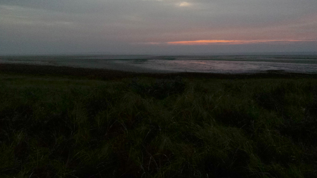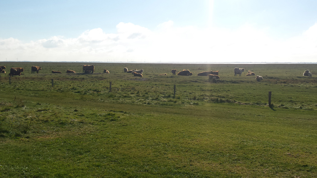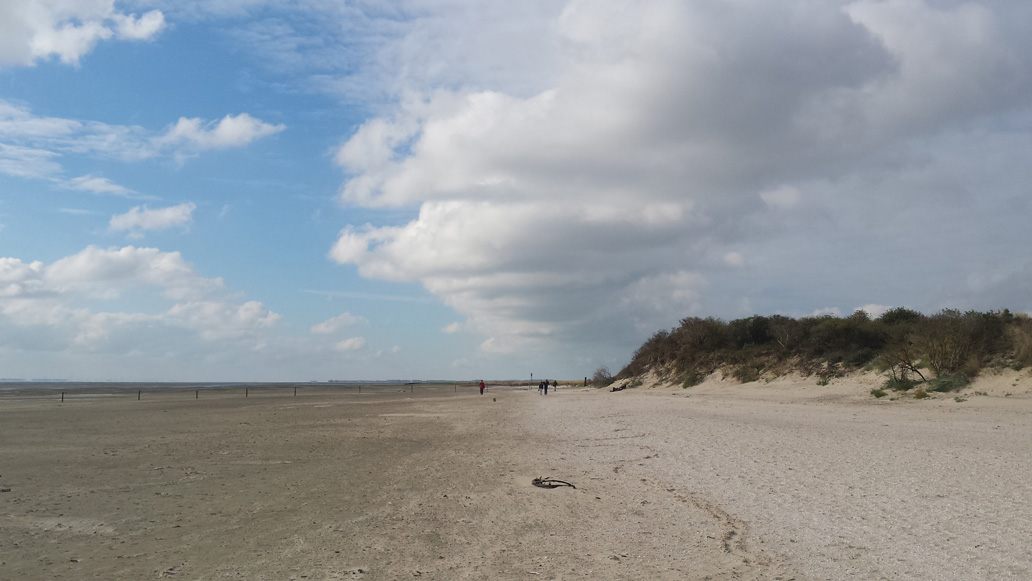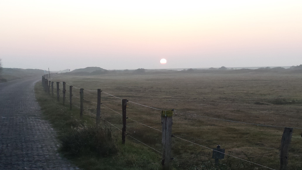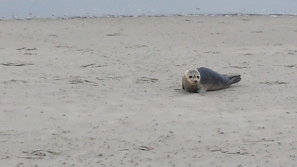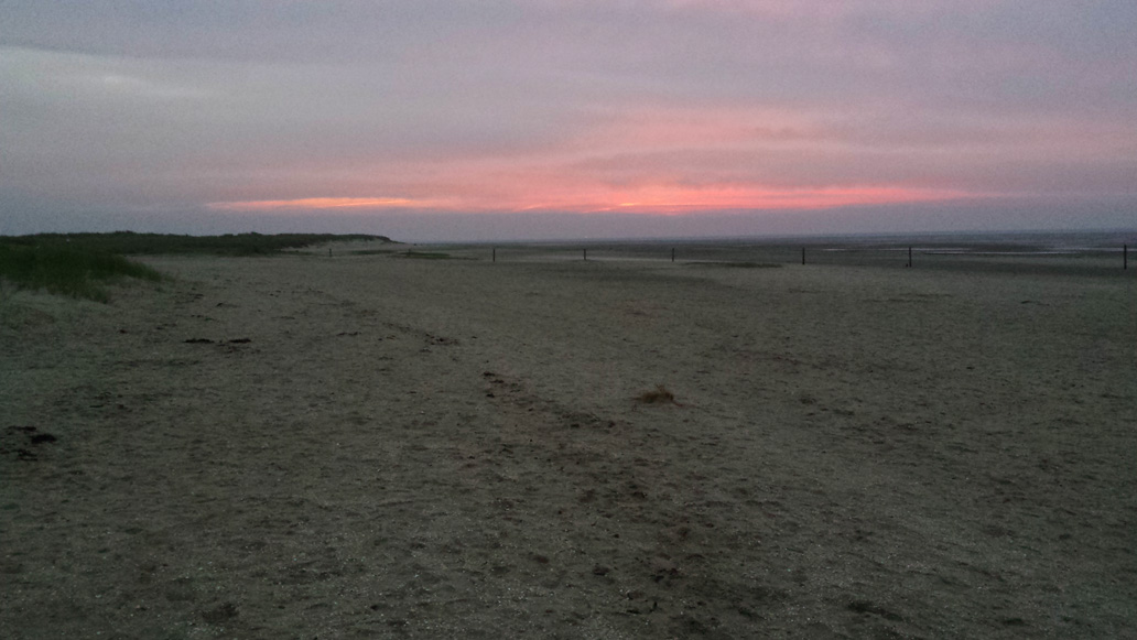 Um 6:30 fahre ich mit dem Fahrrad an das östliche Ende der Insel, um dort den Sonnenaufgang zu sehen. Am Osterhook ist eine Beobachtungsstation für Vögel und Robben in einer großen, unzugänglichen Ruhezone für die Tiere. Schon bevor es hell wird kann man sehr viele verschiedene Vogelrufe hören. Der Sonnenaufgang ist heute nicht ganz so spektakulär, wie am Vortag. Aber am späten Vormittag kommt die Sonne wieder raus und wir fahren noch mal gemeinsam ans Ostende. Gegen 13 Uhr steht die Flut hoch und die riesigen Vogelscharen (Seeschwalben, Kormorane, Möven und andere) tummeln sich in Landnähe am Strand.