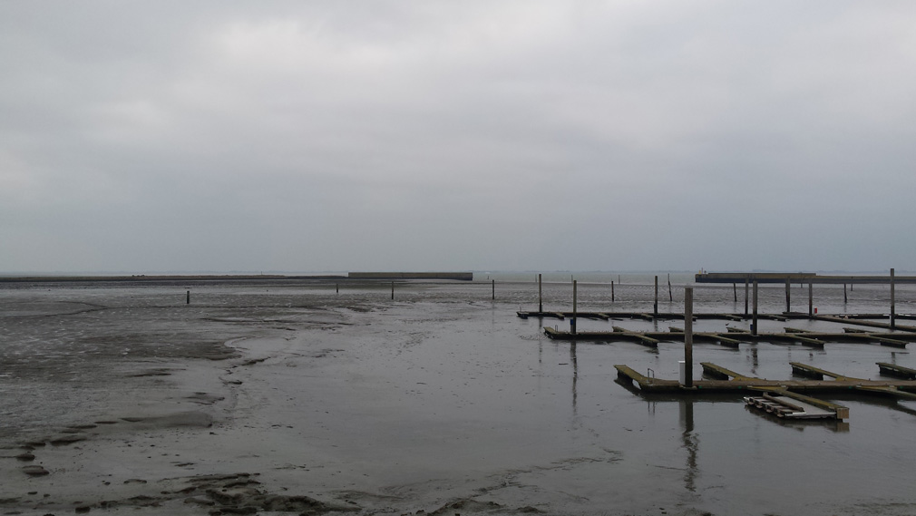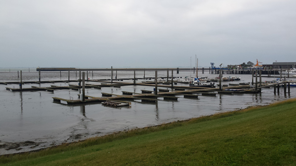 Der Hafen liegt im Süden von Langeoog. Gegenüber sieht man das Festland mit den zahlreichen Windparks. Von hier aus erstreckt sich nach Osten ein breiter Streifen des Wattenmeers.