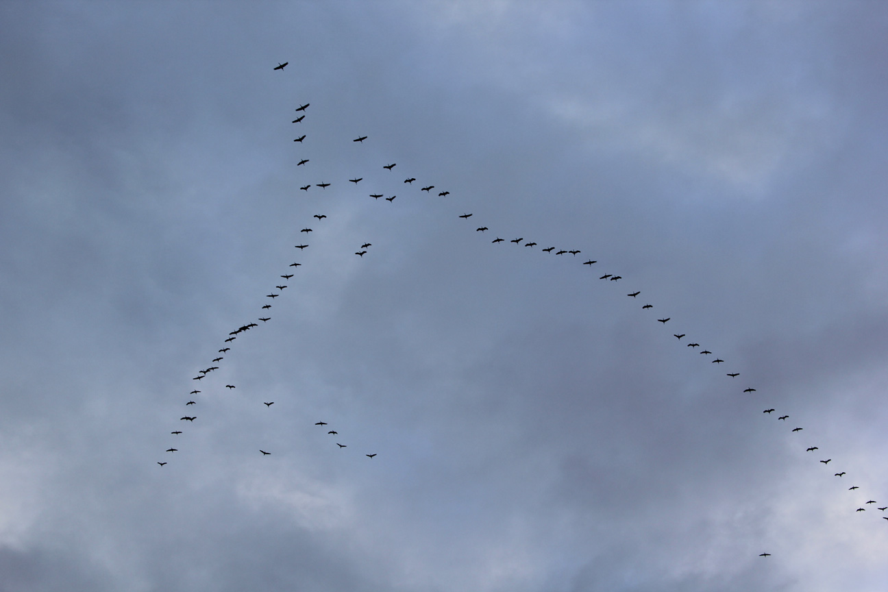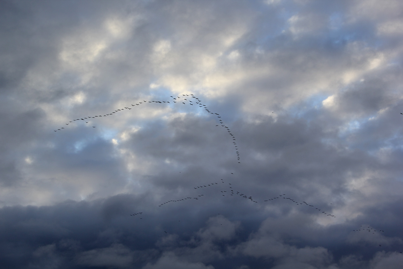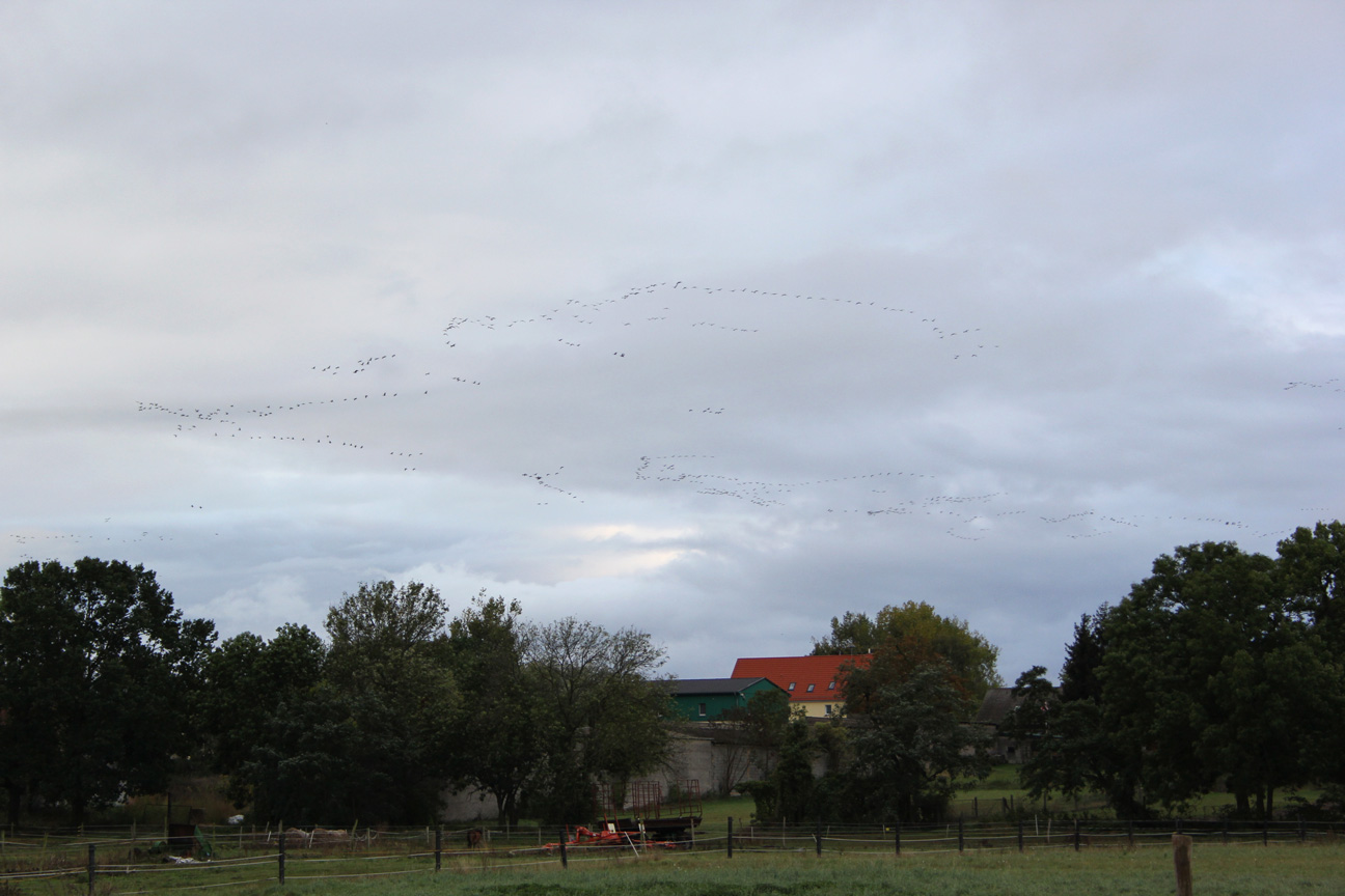 Für uns war der Besuch in Linum nur ein netter Ausflug. Aber die Kraniche, die wir dort getroffen haben, die waren auf einer sehr großen Reise. Wie jedes Jahr im Herbst sammeln sie sich in riesiegen Scharen auf Wiesen hinter mehreren großen Teichen in einem Wasser- und Naturschutzgebiet. Zu Stoßzeiten – also jetzt – sind hier über 100.000 Kraniche täglich. Von hier aus fliegen sie weiter in den Süden.
