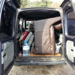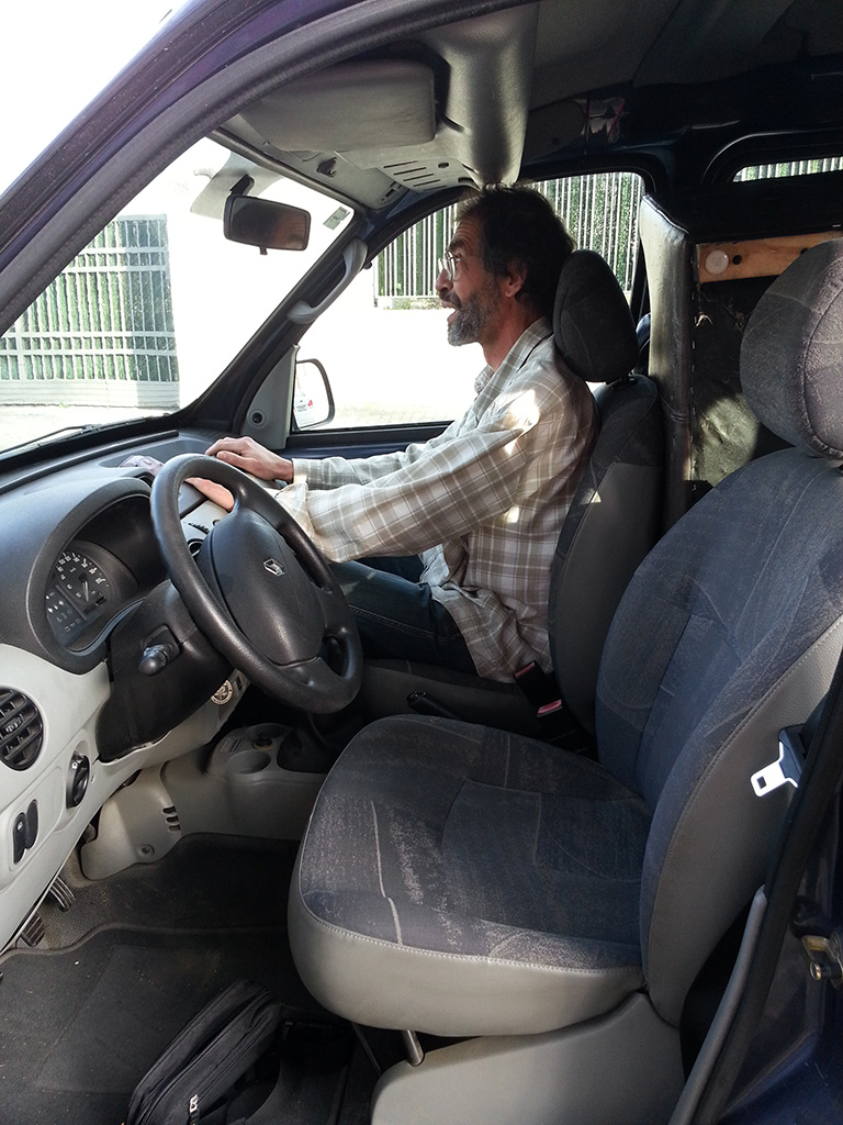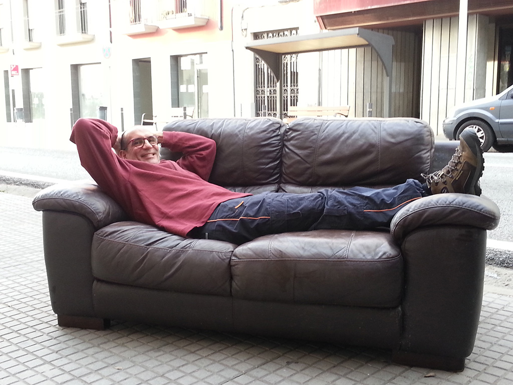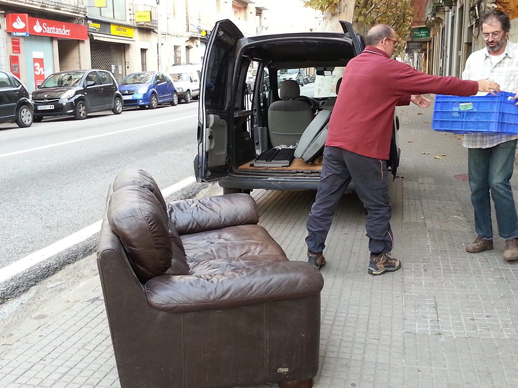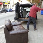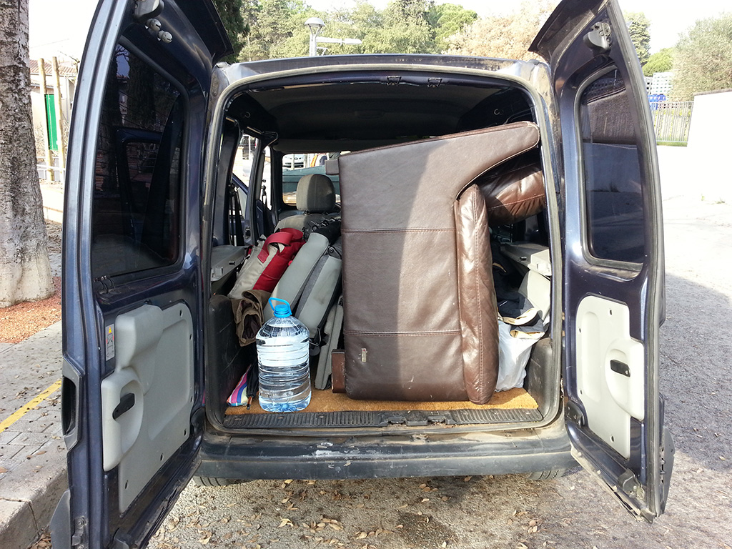 Das Ledersofa hat einen Fan gefunden: Pablo, Joans Freund. Heute bringen wir das Sofa zu ihm nach Cardedeu. Der Transport ist Millimeterarbeit: das Sofa geht ganz knapp in Joans Auto, nachdem wir die Rücksitze ausgebaut haben. Auf dem Beifahrersitz bleibt allerdings nur noch weng Platz und für Pep wird die Fahrt ziemlich unbequem.