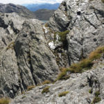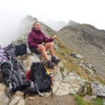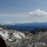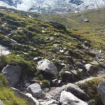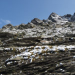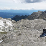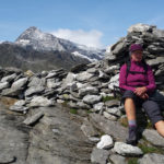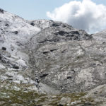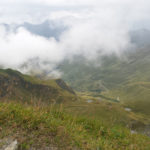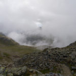 Der Weg ist gut befestigt und lückenlos markiert. Auf Geröll und Felsen windet er sich immer steiler in die Höhe. Man muss beim gehen ständig auf den Untergrund schauen um nicht danebenzutreten. Aber trotzdem kann ich den Blick nicht von den Bergen wenden. Sie scheinen uns anzuschauen wie lebendige Wesen. Kaum ist man 50 m weitergegangen, sind die Berge, die da eben noch waren, weg und andere Berge schauen auf uns herab mit dem gleichgültigen Blick, der sagt: “Wir haben euch nicht gebeten, hier hochzuklettern. Tut, was ihr nicht lassen könnt.” Endlich erreichen wir die Schneebergscharte auf 2700 m Höhe. Von hier aus können wir die Schneeberghütte auf der anderen Seite schon sehen. Oben machen wir eine Weile Pause und genießen die Aussicht über die beiden Täler – immer noch in dichten Wolken.