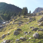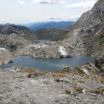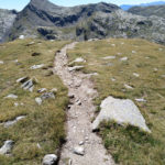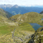 Kerstin und ich verlassen die Hütte in Richtung Süden, wo wir noch ein paar Windungen weiter dem Tiroler Höhenweg folgen wollen. Zunächst steigen wir wieder einige 100 Meter auf in Richtung Mutspitz. Beim Aufstieg können wir am gegenüberliegenden Berghang Heide als kleinen, hellen Punkt ausmachen. Sie wird heute tatsächlich bis zum Spronserjoch aufsteigen, alle Seen besuchen und den gesamten Abstieg bis nach Dorf Tirol zurücklegen. Den Rucksack hat sie auf der Bockerhütte gelassen und wird ihn dort beim Abstieg wieder einsammeln.
