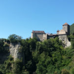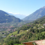 Der Weg, den Kerstin und ich eingeschlagen haben, fällt vom Mutkopf an steil ab. Bald – am Muthof, wo wir eine herrliche Buttermilch trinken – können wir zum ersten Mal Meran in dem weiten Tal unter uns sehen. Das Tal ist noch endlos weit entfernt und uns wird beim Absteigen schnell klar, warum fast alle Wanderer, die wir bis hierher getroffen haben, über die Hälfte der Höhe mit der Seilbahn zurücklegen. Trotzdem beschließen wir, den Abstieg zu Fuß weiterzugehen, wohl auch, weil es unser letzter Wandertag ist und wir ihn nicht voreilig verkürzen wollen. Am Schluss sind unsere Füße, Knie und auch die Lust am Laufen komplett überstrapaziert. Der Weg ist durchgehend extrem steil und als wir endlich, nach 4,5 Stunden Abstieg, am Schloss Tirol ankommen, wollen wir keinen Schritt mehr gehen. Das Cafe am Schloss ist leider Montags geschlossen, also schleppen wir uns noch bis in den nächsten Biergarten im Dorf Tirol.