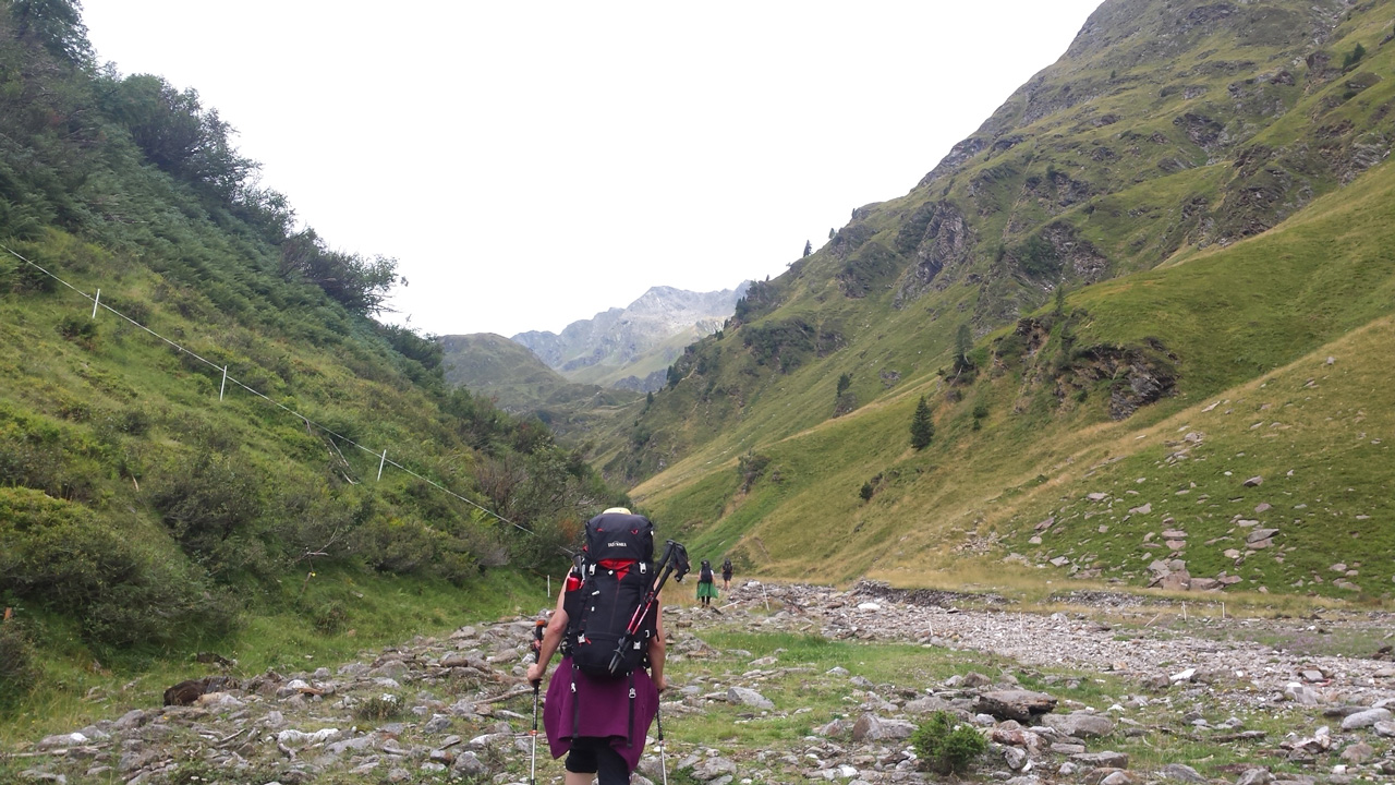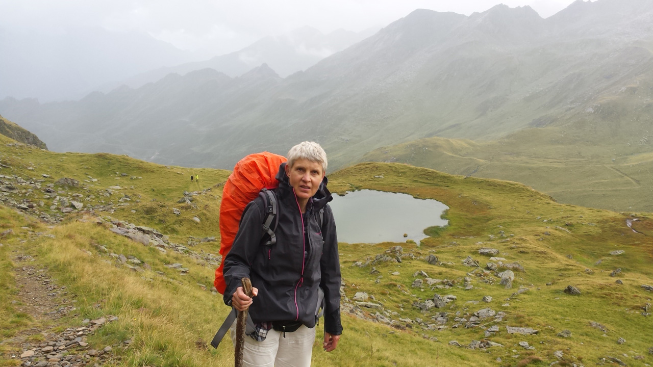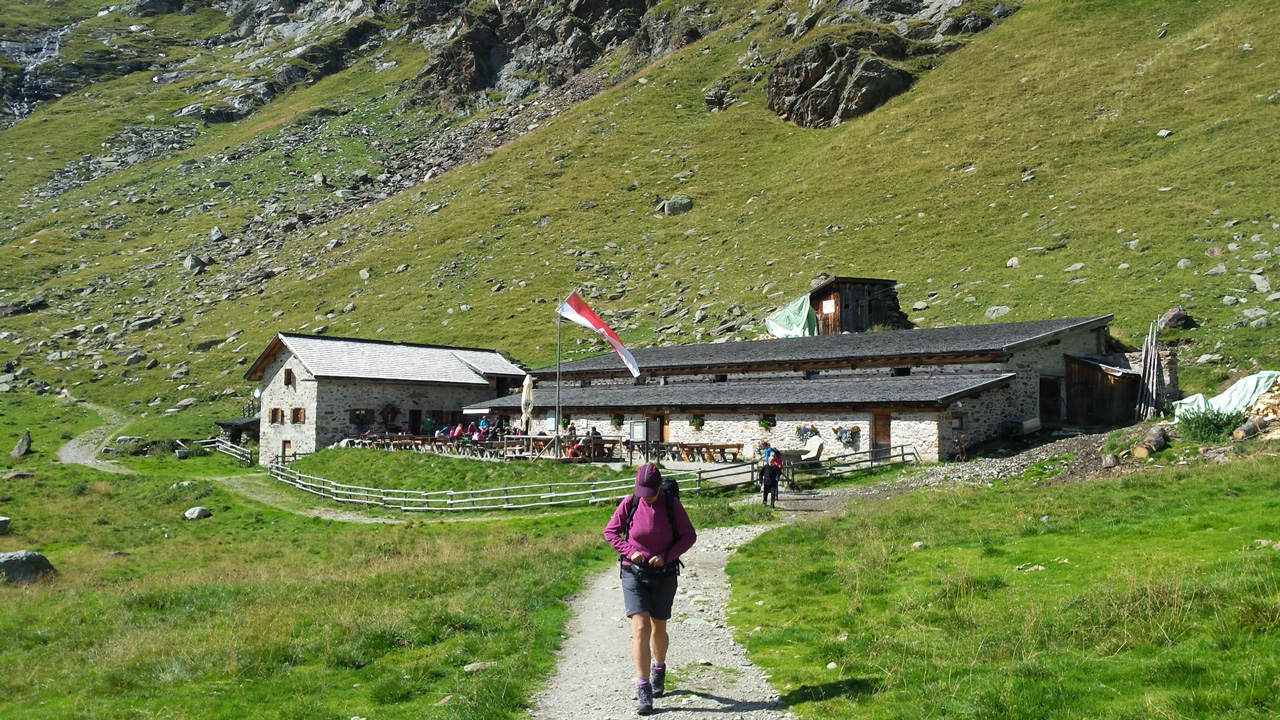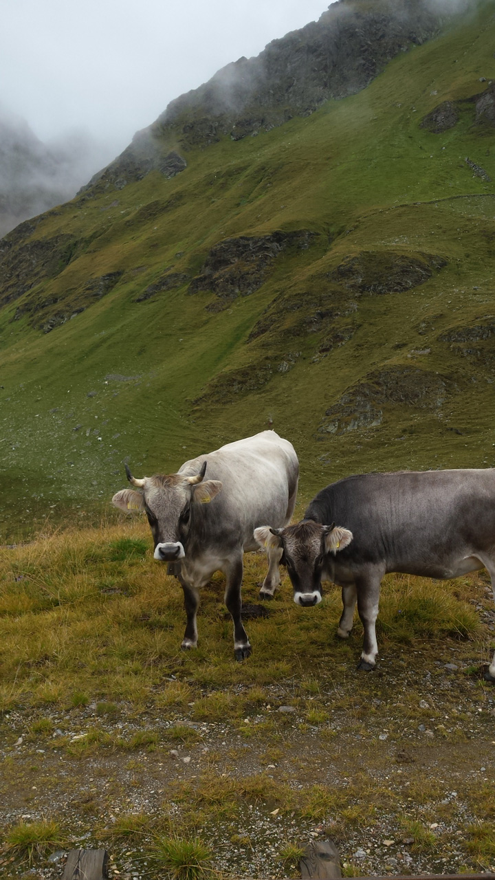Nach einem ausgedehnten Frühstück im Jörgelehof starten wir unsere Wandertour auf dem Romedius-Pilgerweg. Der heutige Abschnitt ist kurz – nur 12 km liegen vor uns. Aber auf diesen werden wir 1300 Höhenmeter überwinden, bevor wir unser heutiges Ziel, die Schneeberghütte, erreichen. Bis zur Stadlalm führt eine sehr schmale, geteerte Straße am Fluss aufwärts. Das Gurgeln des Wassers wird uns bis zum Aufstieg über den Pass ständig begleiten. Später, nachdem der Asphalt aufgehört hat, gesellen sich Kuhglocken zum Rauschen des Flusses. Auf der Moarerbergalm kehren wir im Poschhaus ein. Hier treffen wir auf ein paar Mountainbiker – von denen gibt es erstaunlich viele hier – und zwei Wanderer aus Brandenburg, die denselben Weg laufen wie wir, aber in die entgegengesetzte Richtung. Der Himmel ist verhangen, vor uns sind die Wipfel der Berge von dicken Wolken bedeckt. Für heute abend oder morgen ist über 1800 m Schneefall angekündigt. Nach der Pause auf der Moarerbergalm wird der Weg schmaler und der Aufstieg steiler. Immer mal wieder regnet es ein wenig zwischendurch und ein einziger, blitzloser Donner erinnert uns daran, dass “Wetter” hier oben in den Bergen kein Unterhaltungsprogramm auf der Wetter-App ist.