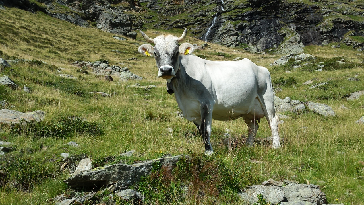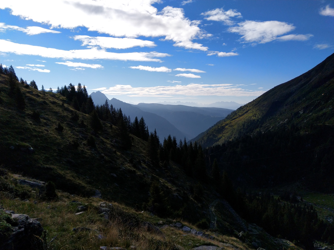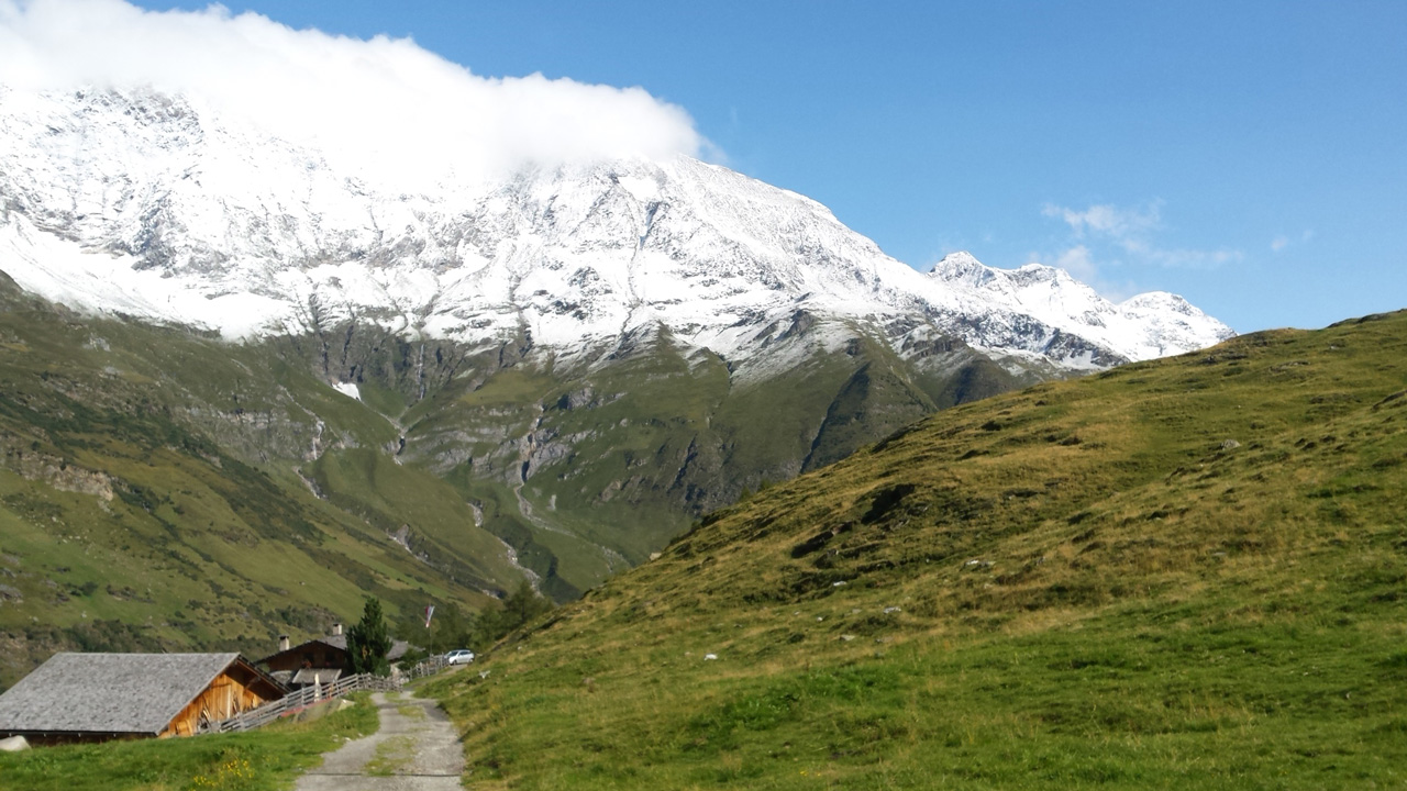 Nach einem ausgedehnten Frühstück im Jörgelehof starten wir unsere Wandertour auf dem Romedius-Pilgerweg. Der heutige Abschnitt ist kurz – nur 12 km liegen vor uns. Aber auf diesen werden wir 1300 Höhenmeter überwinden, bevor wir unser heutiges Ziel, die Schneeberghütte, erreichen. Bis zur Stadlalm führt eine sehr schmale, geteerte Straße am Fluss aufwärts. Das Gurgeln des Wassers wird uns bis zum Aufstieg über den Pass ständig begleiten. Später, nachdem der Asphalt aufgehört hat, gesellen sich Kuhglocken zum Rauschen des Flusses. Auf der Moarerbergalm kehren wir im Poschhaus ein. Hier treffen wir auf ein paar Mountainbiker – von denen gibt es erstaunlich viele hier – und zwei Wanderer aus Brandenburg, die denselben Weg laufen wie wir, aber in die entgegengesetzte Richtung. Der Himmel ist verhangen, vor uns sind die Wipfel der Berge von dicken Wolken bedeckt. Für heute abend oder morgen ist über 1800 m Schneefall angekündigt. Nach der Pause auf der Moarerbergalm wird der Weg schmaler und der Aufstieg steiler. Immer mal wieder regnet es ein wenig zwischendurch und ein einziger, blitzloser Donner erinnert uns daran, dass “Wetter” hier oben in den Bergen kein Unterhaltungsprogramm auf der Wetter-App ist.