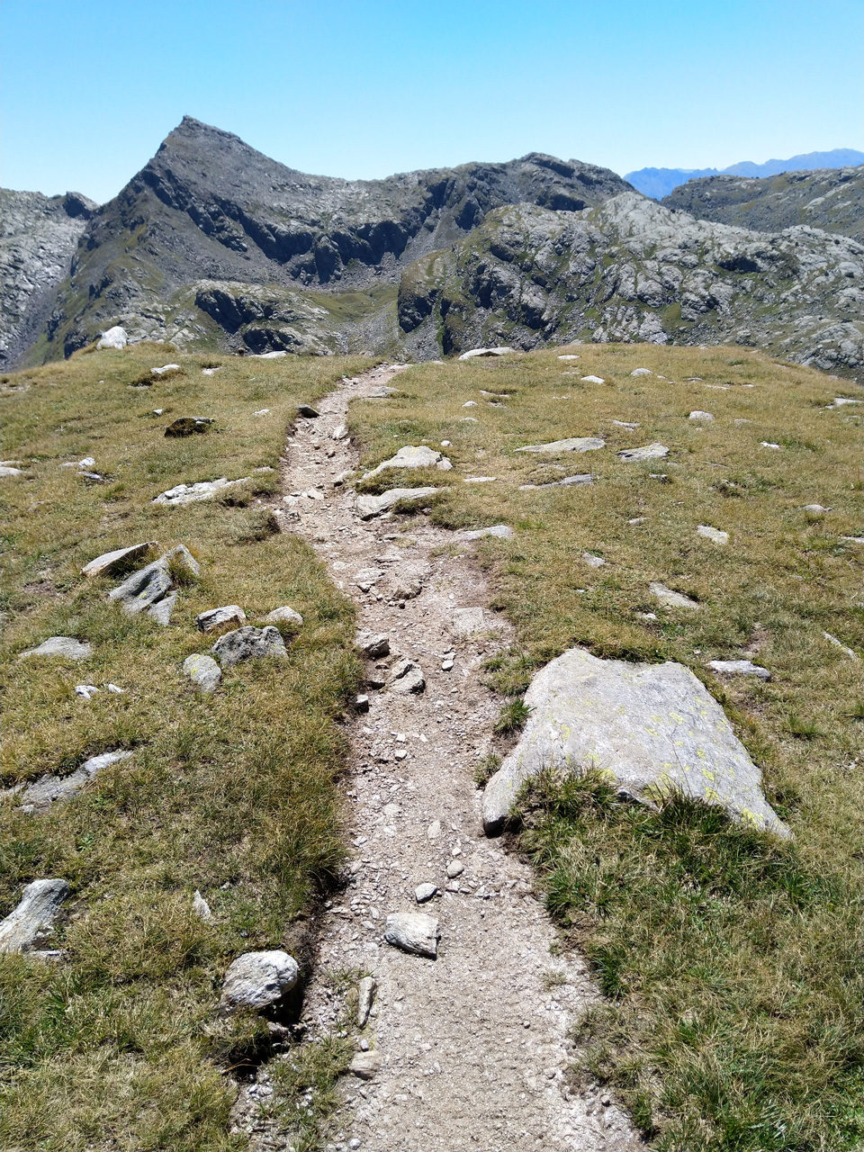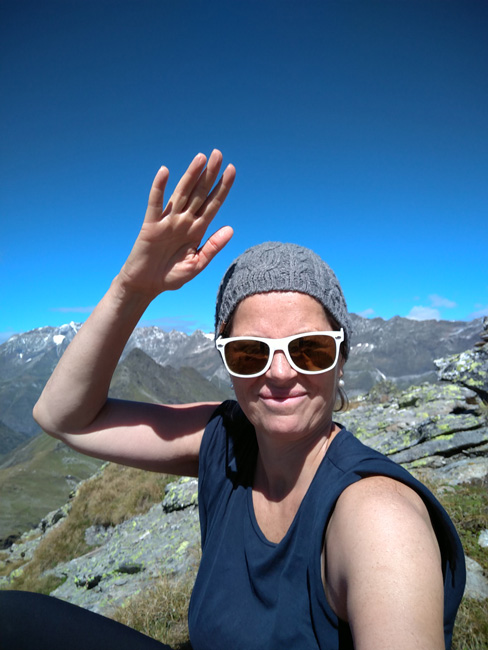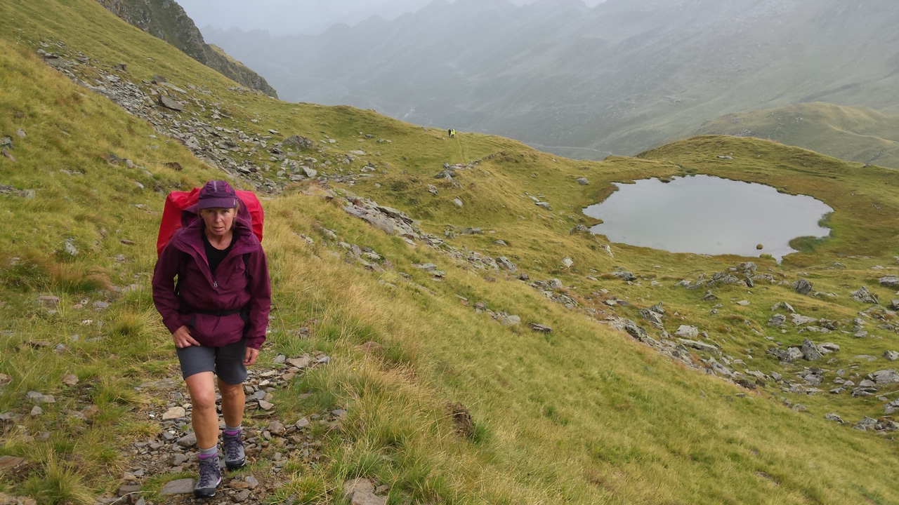 Kerstin und ich verlassen die Hütte in Richtung Süden, wo wir noch ein paar Windungen weiter dem Tiroler Höhenweg folgen wollen. Zunächst steigen wir wieder einige 100 Meter auf in Richtung Mutspitz. Beim Aufstieg können wir am gegenüberliegenden Berghang Heide als kleinen, hellen Punkt ausmachen. Sie wird heute tatsächlich bis zum Spronserjoch aufsteigen, alle Seen besuchen und den gesamten Abstieg bis nach Dorf Tirol zurücklegen. Den Rucksack hat sie auf der Bockerhütte gelassen und wird ihn dort beim Abstieg wieder einsammeln.