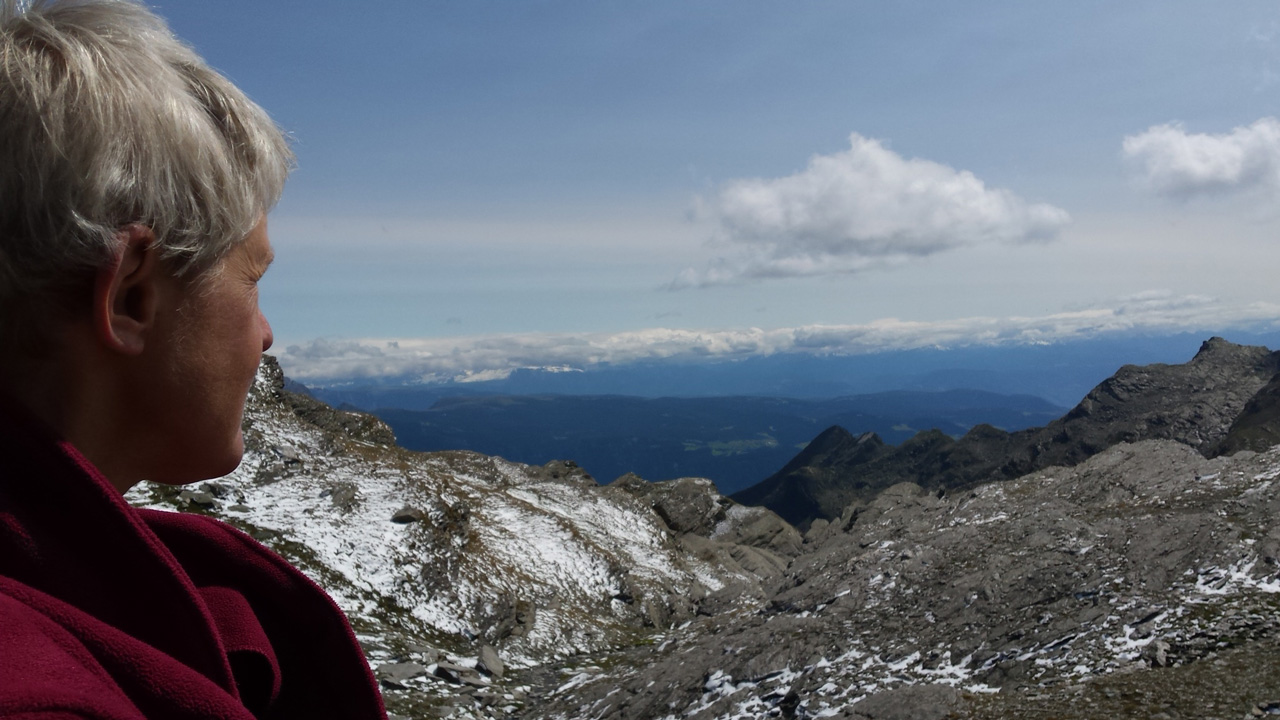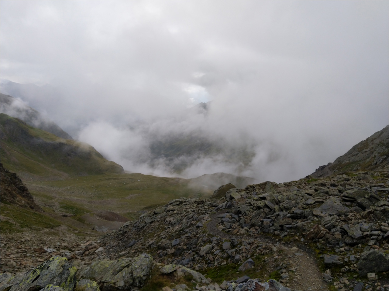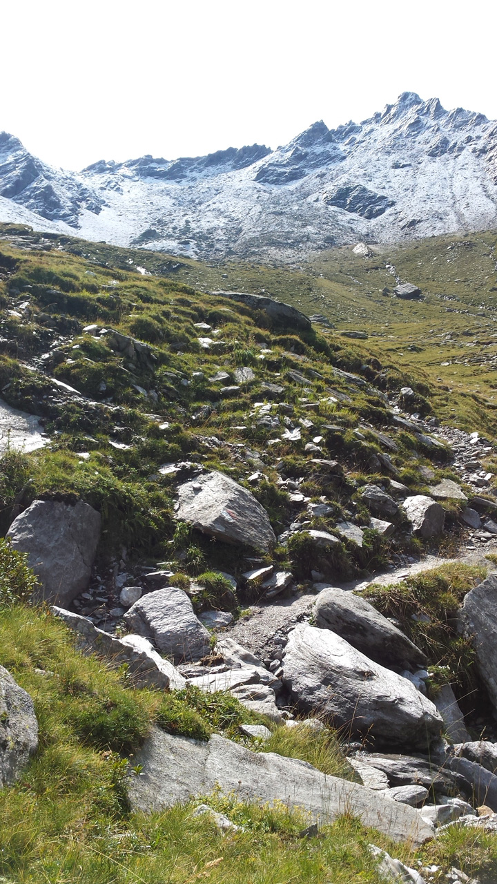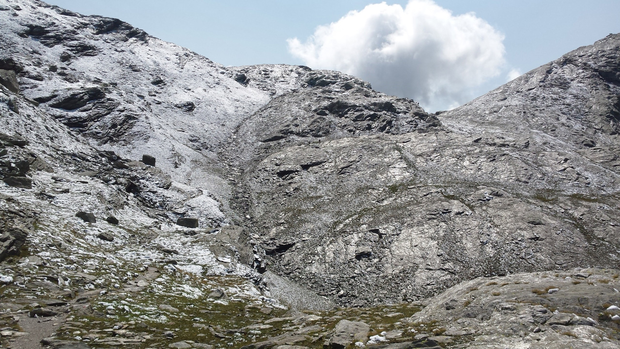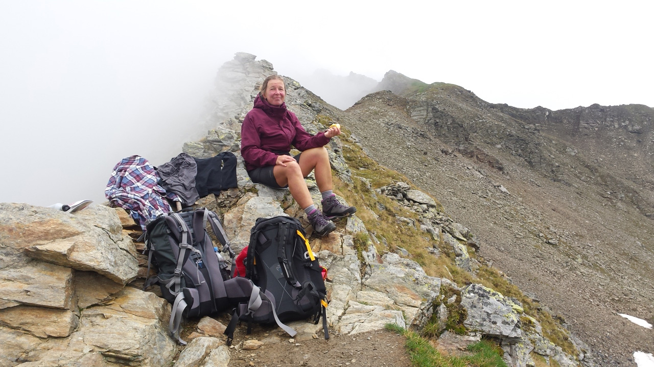 Der Weg ist gut befestigt und lückenlos markiert. Auf Geröll und Felsen windet er sich immer steiler in die Höhe. Man muss beim gehen ständig auf den Untergrund schauen um nicht danebenzutreten. Aber trotzdem kann ich den Blick nicht von den Bergen wenden. Sie scheinen uns anzuschauen wie lebendige Wesen. Kaum ist man 50 m weitergegangen, sind die Berge, die da eben noch waren, weg und andere Berge schauen auf uns herab mit dem gleichgültigen Blick, der sagt: “Wir haben euch nicht gebeten, hier hochzuklettern. Tut, was ihr nicht lassen könnt.” Endlich erreichen wir die Schneebergscharte auf 2700 m Höhe. Von hier aus können wir die Schneeberghütte auf der anderen Seite schon sehen. Oben machen wir eine Weile Pause und genießen die Aussicht über die beiden Täler – immer noch in dichten Wolken.