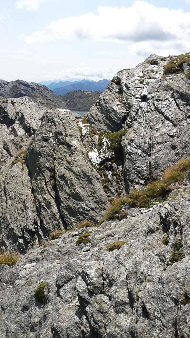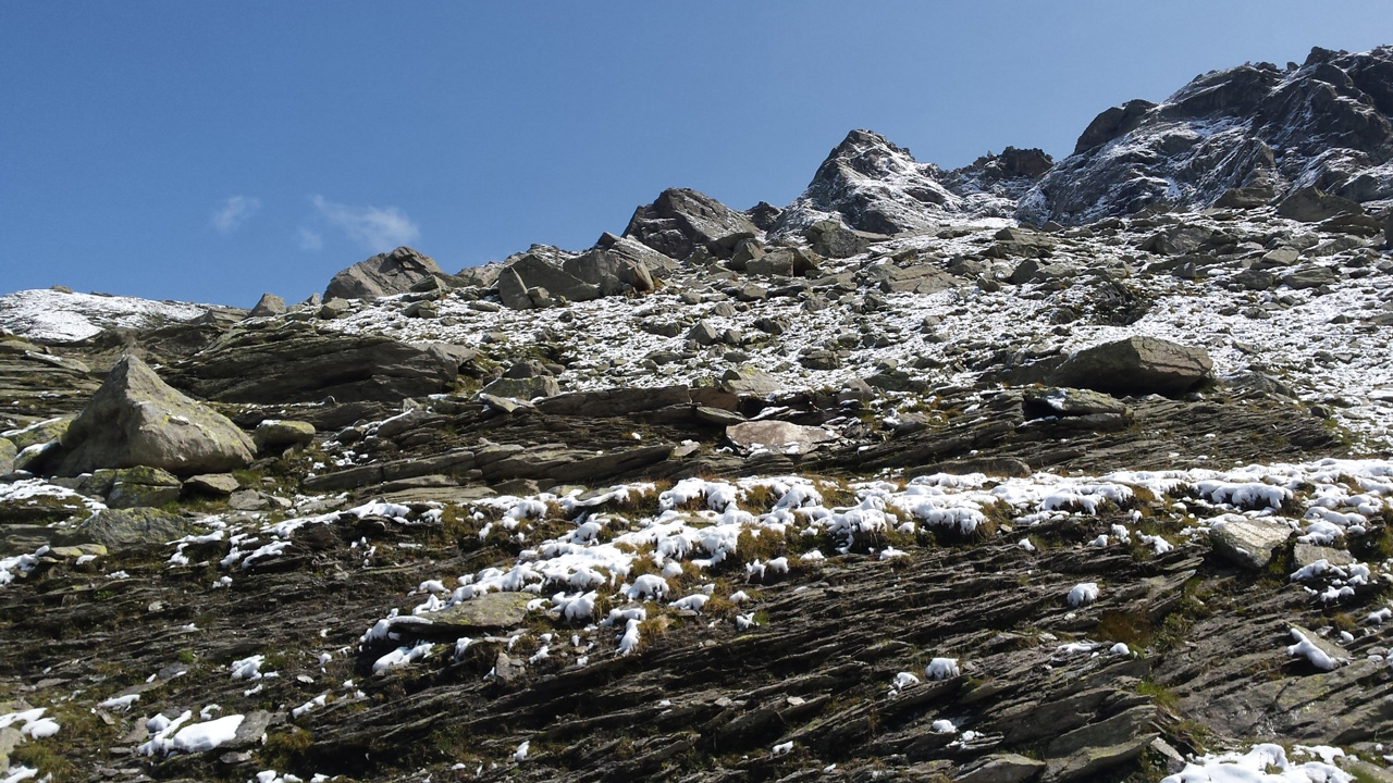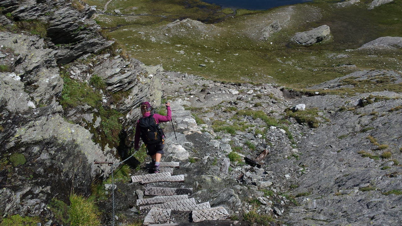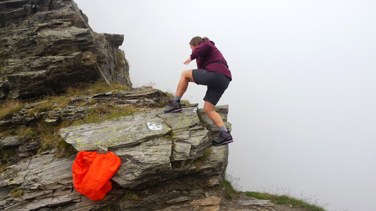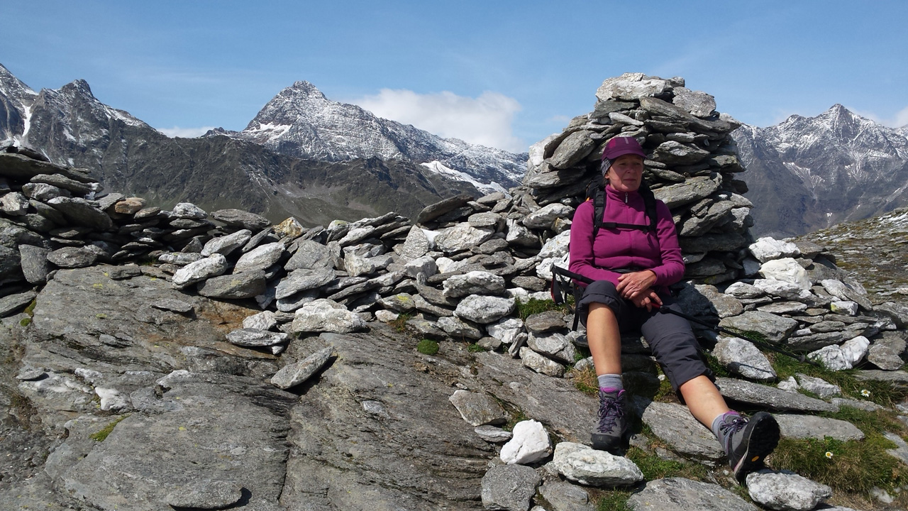 Der Weg ist gut befestigt und lückenlos markiert. Auf Geröll und Felsen windet er sich immer steiler in die Höhe. Man muss beim gehen ständig auf den Untergrund schauen um nicht danebenzutreten. Aber trotzdem kann ich den Blick nicht von den Bergen wenden. Sie scheinen uns anzuschauen wie lebendige Wesen. Kaum ist man 50 m weitergegangen, sind die Berge, die da eben noch waren, weg und andere Berge schauen auf uns herab mit dem gleichgültigen Blick, der sagt: “Wir haben euch nicht gebeten, hier hochzuklettern. Tut, was ihr nicht lassen könnt.” Endlich erreichen wir die Schneebergscharte auf 2700 m Höhe. Von hier aus können wir die Schneeberghütte auf der anderen Seite schon sehen. Oben machen wir eine Weile Pause und genießen die Aussicht über die beiden Täler – immer noch in dichten Wolken.