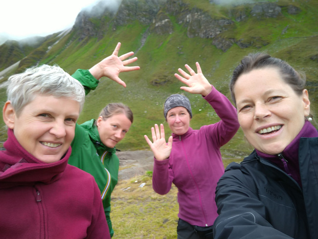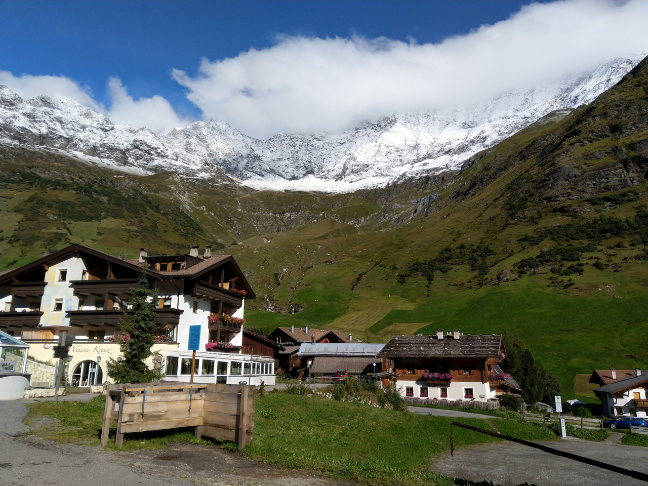 Es regnet mal stärker, mal schwächer. Gegen 15 Uhr erreichen wir Moos. Hier treffen wir wieder mit Heide und Jutta zusammen, die mit dem Bus aus Rabenstein gekommen sind. Unser Zielort Pfelders ist immer noch gute 4 Wanderstunden entfernt. Nach einem Cafébesuch in Moos nehmen wir alle zusammen den Bus nach Pfelders. Die Fahrt dorthin bestätigt uns, dass wir am heutigen Tag nichts verpasst haben. In Pfelders haben wir Unterkunft im Hotel Alpenblick, wo wir uns mit Sauna und Schwimmbad entspannen und das ausgezeichnete Essen genießen.