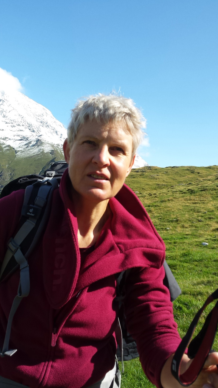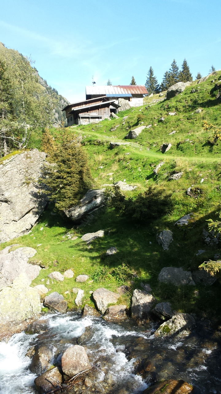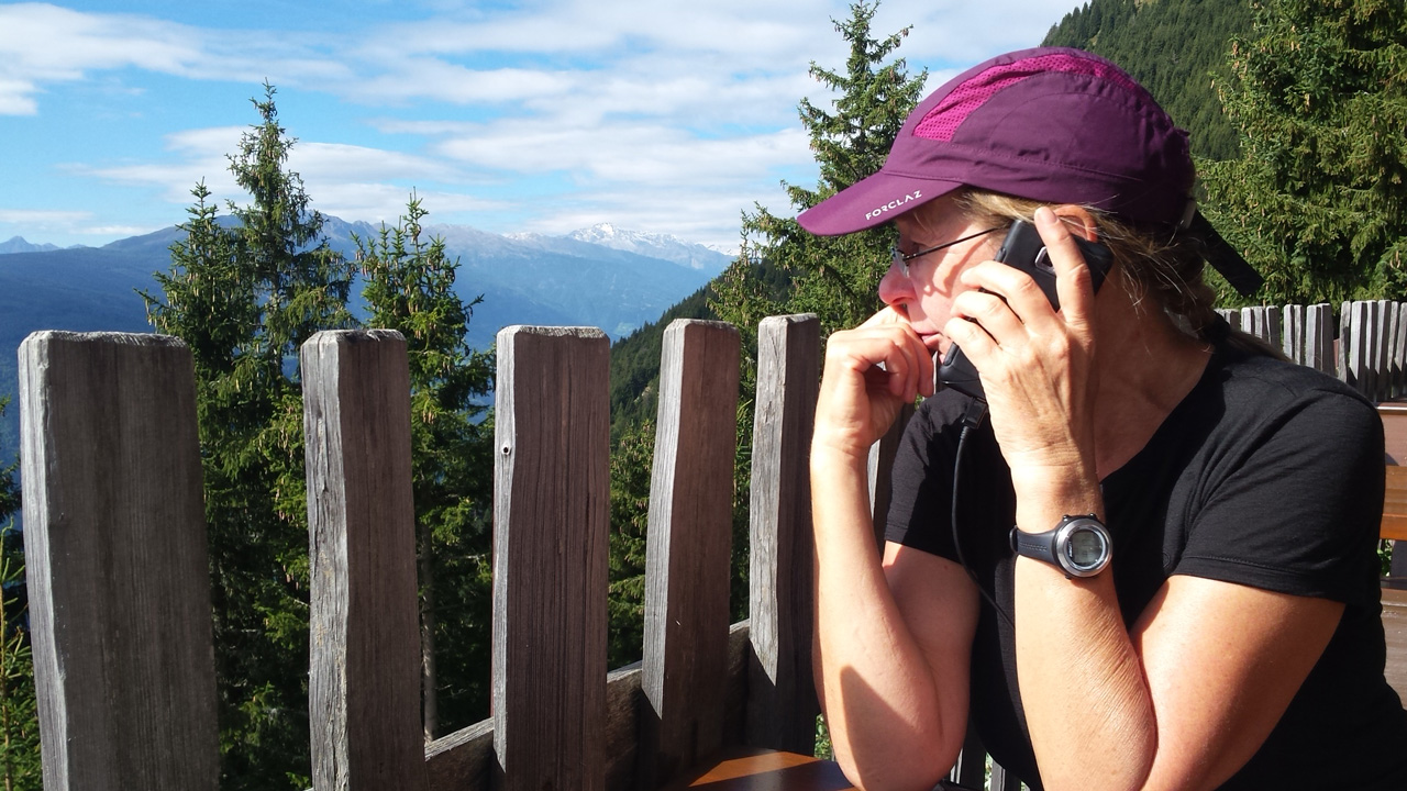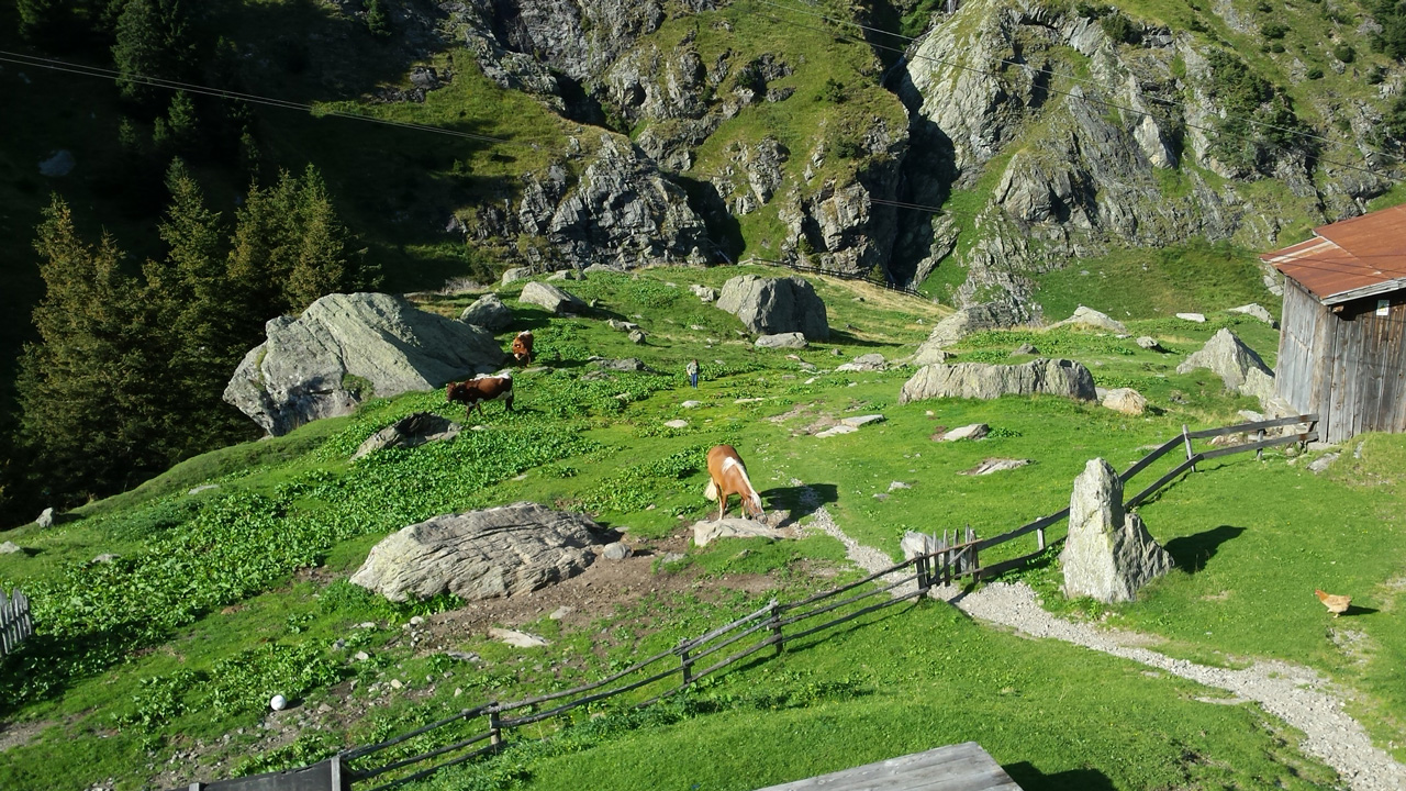 Der Weg ins Tal ist sehr gut präpariert aber auch sehr steil. Er führt immer am reißenden Spronserbach entlang abwärts bis zur Bockerhütte, wo Heide und Jutta schon in der Sonne auf der Terrasse sitzen. Die Hütte ist klein und familiär. Außer der Familie mit zwei Kindern leben hier 4 Kühe, eine hübsche Haflingerstute, Hühner, ein Schwein, ein Kaninchen, eine Katze und wer weiß was noch – ich habe diesen Ort sofort ins Herz geschlossen. Abends ist es kalt und wir sitzen lange in der geheizten Stube. Später kommt noch ein Wanderer. Beim Frühstück erzählt er uns, dass er im Wandern unerfahren ist und sich sehr kurzfristig für die Tour auf dem Romediusweg entschieden hat. Und dass der Pilgerweg einen großen Umbruch in seinem Leben einleitet.