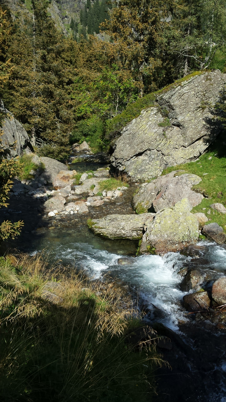 Das Ziel unserer heutigen Route ist Pfelders. Es hat in der Nacht viel geregnet, aber jetzt lockert der Himmel etwas auf und manchmal kommt die Sonne durch. Von der Schneeberghütte geht es sehr steil abwärts ins Tal. Dort führt ein leichtgängiger Weg sehr entspannt am Fluss entlang durch eine mächenhafte Landschaft mit kleinen Tannen, Moos und Unmengen von Blaubeeren. Die Entspannung hält nicht lange an, der Abstieg wird wieder steieler und führt uns an vereinzelten Höfen vorbei ins Passeier Tal. Hier überqueren wir die Straße, die von Rabenstein nach Moos führt. Rabenstein erreichen wir kletternd über steile Hänge zwischen Bilderbuchhöfen. Heide und Jutta kehren hier im Gasthof ein, Kerstin und ich laufen auf einem nun nur noch leicht abfallenden Weg neben der Passer nach Moos.