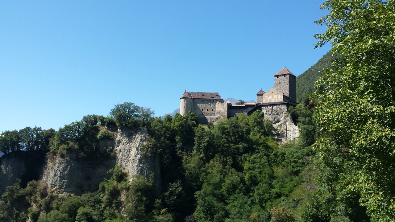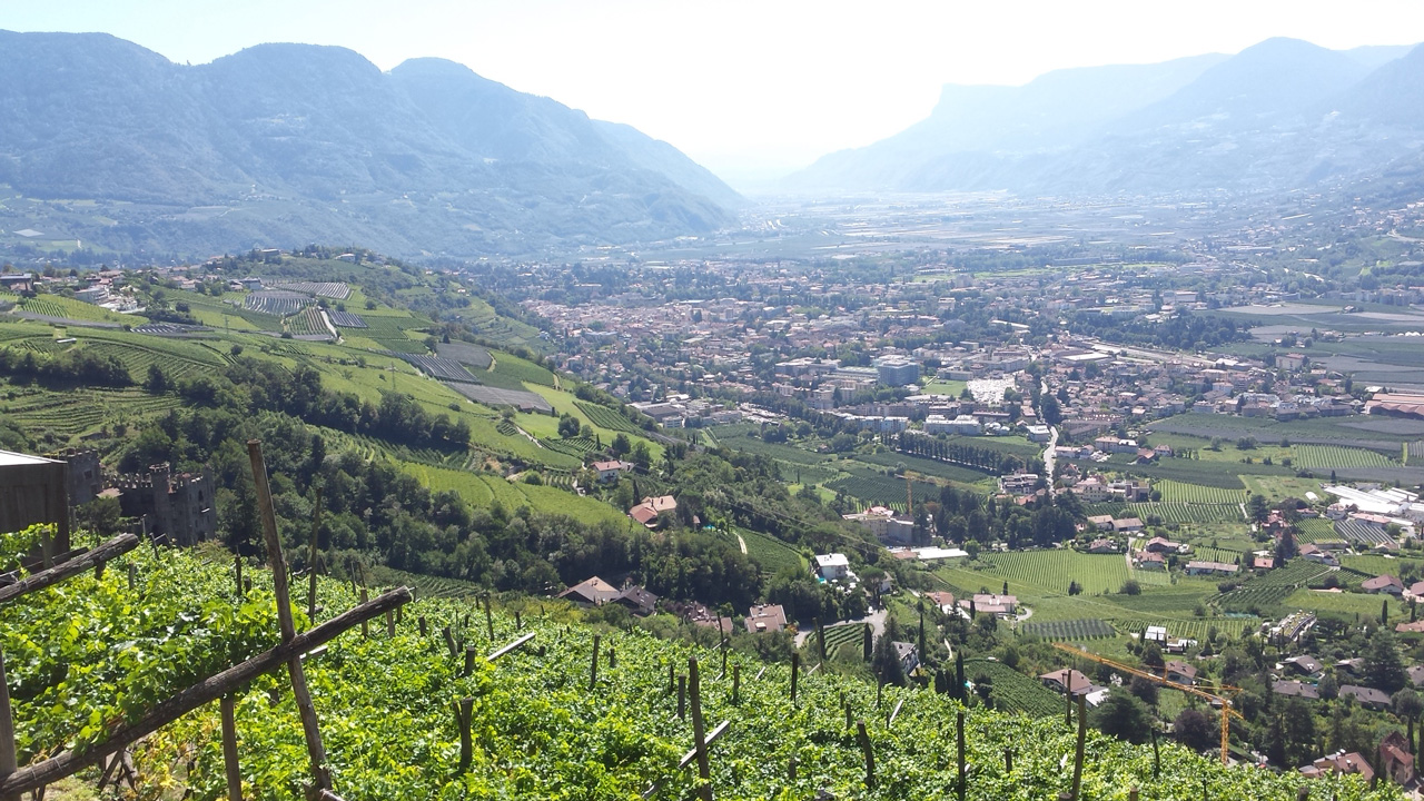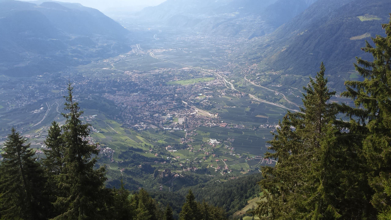 Der Weg, den Kerstin und ich eingeschlagen haben, fällt vom Mutkopf an steil ab. Bald – am Muthof, wo wir eine herrliche Buttermilch trinken – können wir zum ersten Mal Meran in dem weiten Tal unter uns sehen. Das Tal ist noch endlos weit entfernt und uns wird beim Absteigen schnell klar, warum fast alle Wanderer, die wir bis hierher getroffen haben, über die Hälfte der Höhe mit der Seilbahn zurücklegen. Trotzdem beschließen wir, den Abstieg zu Fuß weiterzugehen, wohl auch, weil es unser letzter Wandertag ist und wir ihn nicht voreilig verkürzen wollen. Am Schluss sind unsere Füße, Knie und auch die Lust am Laufen komplett überstrapaziert. Der Weg ist durchgehend extrem steil und als wir endlich, nach 4,5 Stunden Abstieg, am Schloss Tirol ankommen, wollen wir keinen Schritt mehr gehen. Das Cafe am Schloss ist leider Montags geschlossen, also schleppen wir uns noch bis in den nächsten Biergarten im Dorf Tirol.