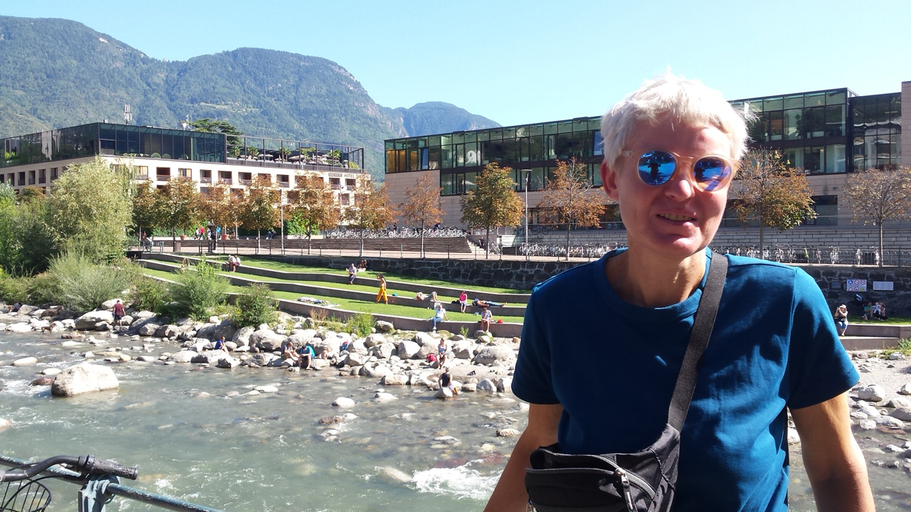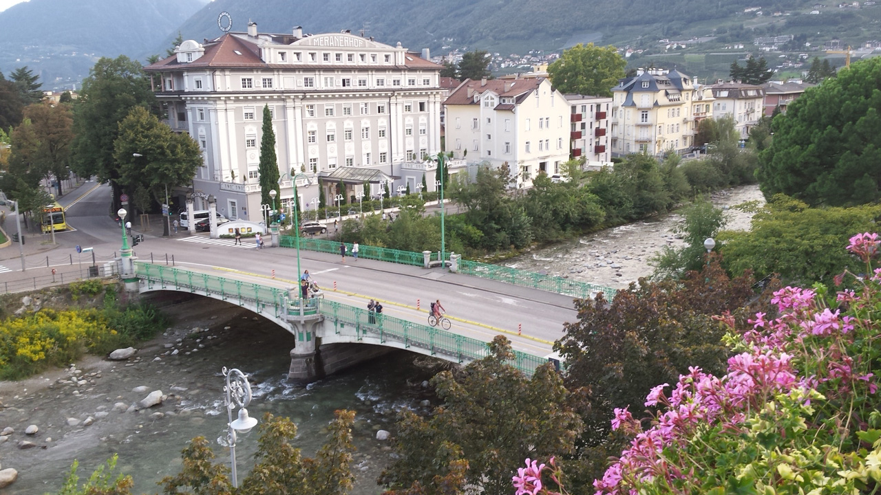 Nach Knödeln und Salat fahren wir von hier aus mit dem Bus bis Meran. Um kurz vor 15 Uhr landen wir im Hotel Aurora, direkt an der Promenade. Jutta war schon um 12 Uhr angekommen und hat sich in die Thermen direkt am Flussufer gegenüber zurückgezogen.