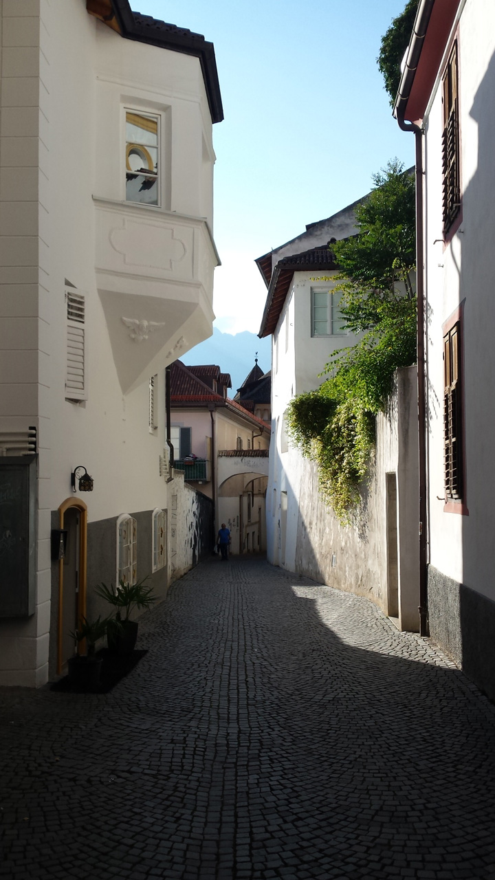 Meran strahlt in der Sonne vor dem überwältigenden Panorama der umgebenden Berge. Es ist warm, Menschen flanieren entspannt auf der Promenade, trinken Kaffee und essen Eis. Genau so verbringen auch wir den Nachmittag, nachdem wir uns wieder mit Jutta getroffen haben, unter hohen Bäumen vor der romantischen Wandelhalle. Anschließend schlendern wir durch die kleine, beschauliche Innenstadt. Heide kommt am Abend gegen 7 mit dem Bus aus Dorf Tirol und wir verbringen unseren letzten gemeinsamen Abend dieser Tour in einem Restaurant auf der Promenade.